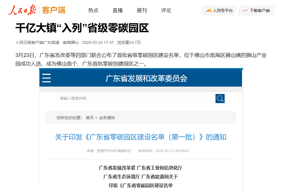 日前,狮山产业园入选 广东省首批零碳园区建设名单 成为“佛山首个”! 并登上人民日报,引发广泛关注 2026-03-23 荣誉背后,更值得深思的是: 在“双碳”目标与制造业当家的背景下 狮山为何主动争取试点? 入选零碳园区 对一个千亿产业大镇而言 意味着什么?又将带来哪些利好?