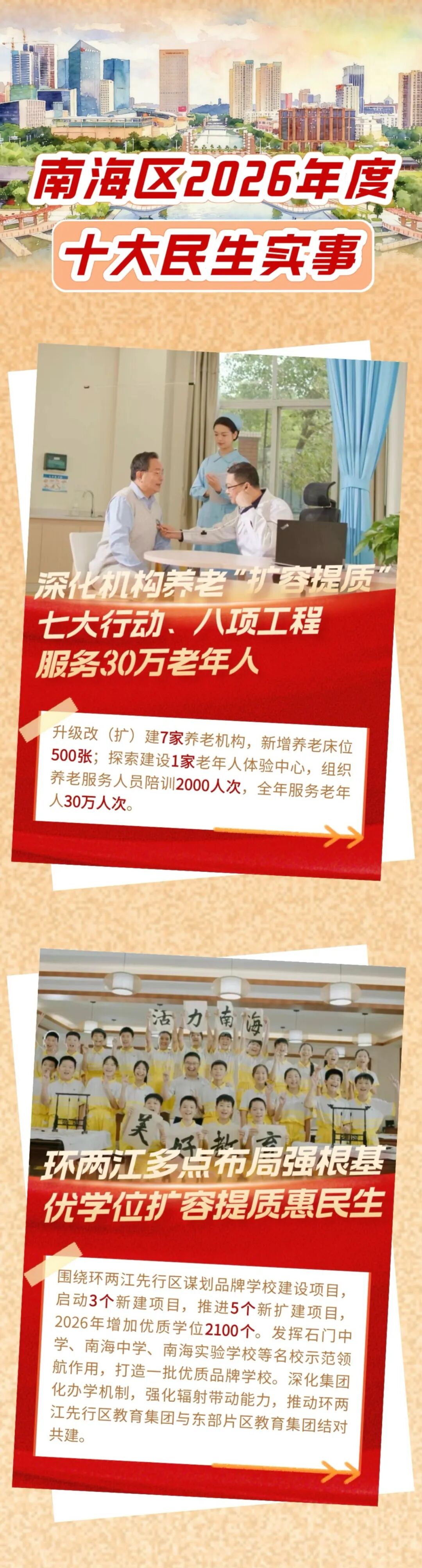 新增养老床位500张增加2100个优质学位打造30分钟救助圈全年推出超10000场次文商旅体活动超6.5万户老旧小区综合提升改造……3月26日经南海区第十七届人民代表大会第六次会议第二次全体会议审议并投票表决南海区2026年度十大民生实事出炉与你息息相关!
