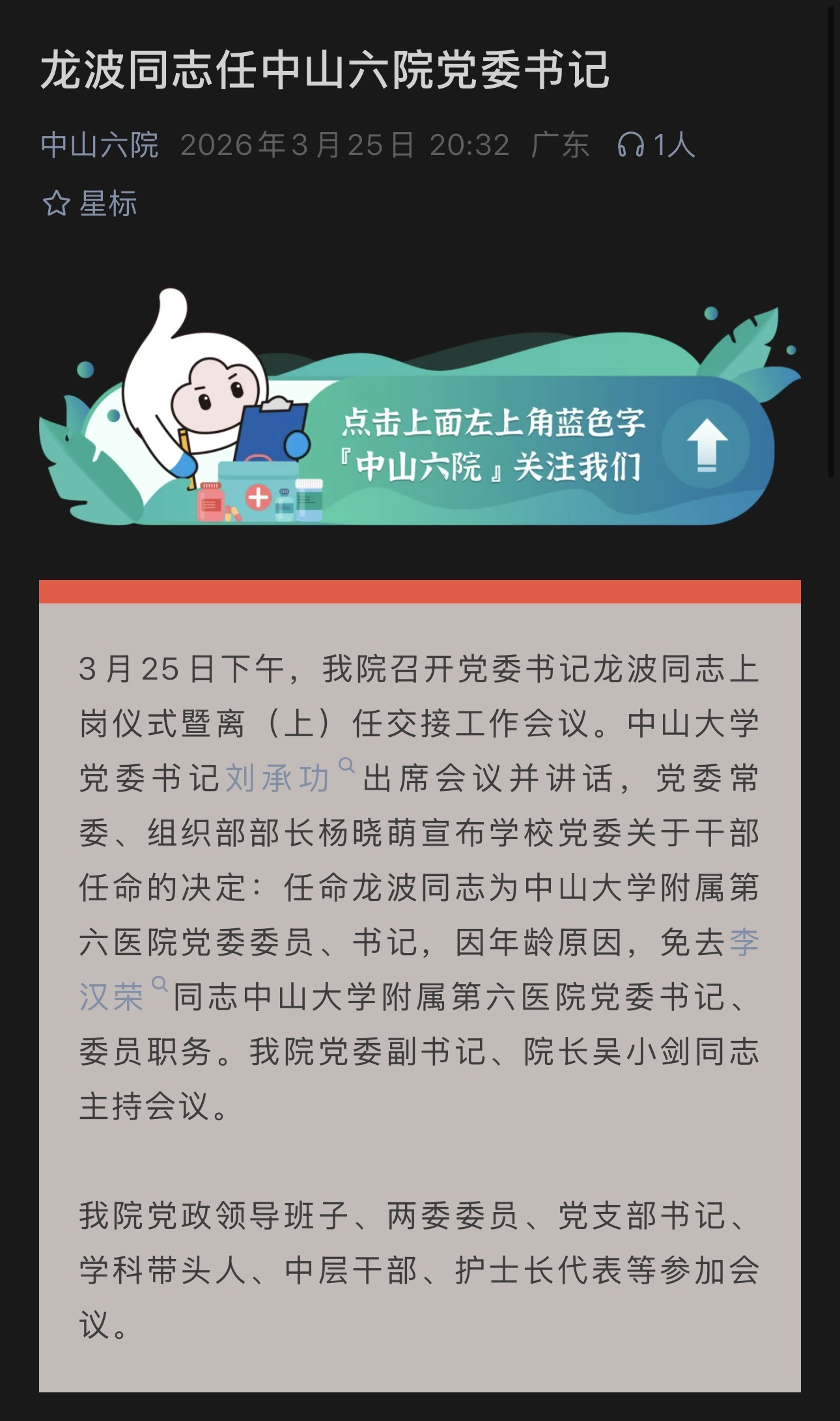 3月25日晚,中山大学附属第六医院发布消息,龙波已任医院党委委员、书记,因年龄原因,免去李汉荣同志医院党委书记、委员职务。
