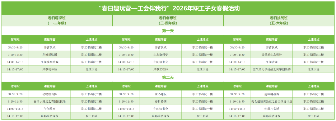 叮!叮!叮! 4月2日-3日 佛山中小学生放春假啦~ 春假是孩子们 走出教室、亲近自然的实践时光 作为娘家人 又来“官方带娃”啦 4月2日-3日 三水区总工会将开展 春日趣玩营,工会伴我行 三水区职工子女春假活动 制作风筝 科学实践 电影赏析 制作美食…… 100个名额待领取 快来关注 为保证公平公正 我们将以抽签的形式进行录取 活动免费参与 报名时间 3月26日15:00-3月27日17:00 为切实服务职工需求,丰富职工子女春假生活,三水区总工会充分发挥工人文化宫阵地作用,精心策划“春日趣玩营,工会伴我行”三水区职工子女春假活动,重点保障职工子女、新业态新就业群体子女、新市民子女,让孩子有个充实、快乐、有收获的春假假期。 ⏰活动时间:4月2日-3日(共两天) ⏰每日时段:8:30-11:30,14:00-17:30(不含午休托管) 活动地点:三水区工人文化宫 参与对象:小学一至六年级学生100人(其中春日萌探班33人,春日创想班33人,春日挑战班34人) 这次春假有啥不一样? 告别枯燥的补习班 这次我们把课堂搬进大自然! 本次活动主打 “春日限定体验+轻知识渗透” 根据孩子年龄分层设计 让每个孩子都能在两天时间里 玩出花样,学得开心 春日萌探班(一至二年级) 课程以趣味体验为主,孩子们将在北江公园收集花瓣树叶制作拼贴画,在风筝协会陈会长的带领下制作并放飞小风筝,还能亲手制作春日限定青团,还有电影赏析、动物模仿操等丰富内容,动静结合,快乐启蒙。