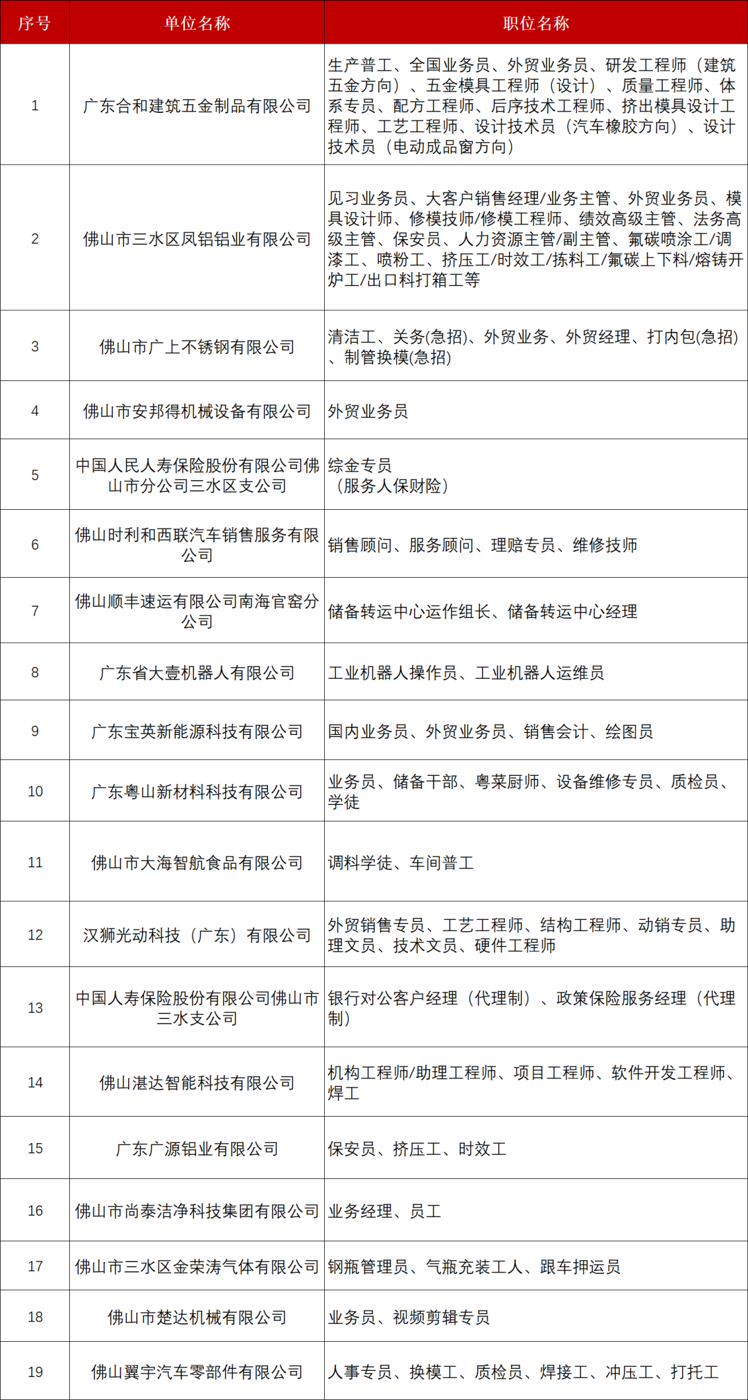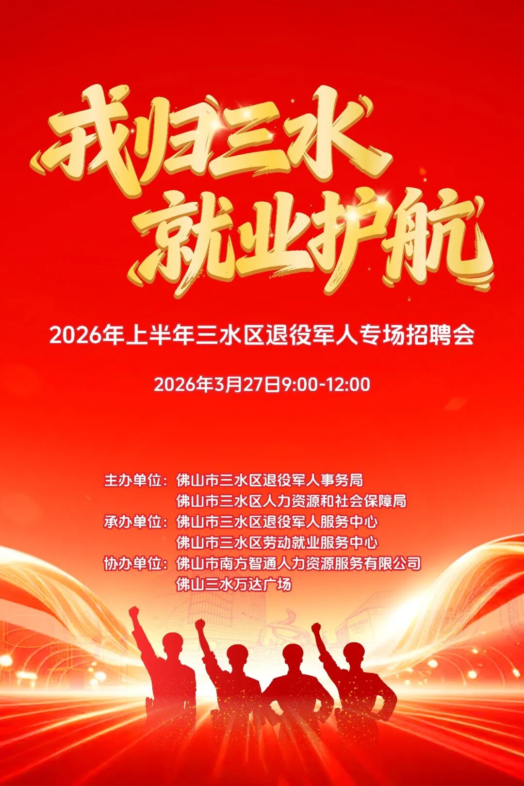 戎耀归乡,就业护航。为了拓宽退役军人就业渠道,实现企业人才需求与退役军人求职需求的精准对接,由佛山市三水区退役军人事务局和佛山市三水区人力资源和社会保障局主办的“2026年上半年退役军人专场招聘会”将于3月27日上午在三水万达广场一号门外广场进行。 我们诚邀三水区及周边的退役军人、随军家属,以及所有有求职意向的高校毕业生、失业人员共同参与。 在这里,28家优质企业虚位以待,AI智能就业服务触手可及,更有免费大巴往返接送。让我们向最可爱的人致敬,为他们的新征程保驾护航! 壹 活动详情 活动时间:2026年3月27日 (周五) 9:00-12:00 活动地点:三水万达广场一号门外广场 贰 活动亮点抢先看 企业洽谈区 与28家优质企业HR,面对面了解岗位详情、洽谈薪资福利,高效锁定心仪工作,精准匹配就业需求! 上方为部分招聘岗位 可上下滑动查看 暖心服务区 招聘会现场不仅是投简历的地方 更是您的“就业加油站”! 现场特设 【暖心服务区】 提供一系列免费服务! ✌ 简历打印:匆匆赶来没带简历?别慌,我们帮您打印。 ✌ 简历优化:专家助你优化简历,让您的简历在HR面前眼前一亮。 ✌ 模拟面试:提前演练,掌握技巧,提升面试通过率。 ✌ 职业规划咨询:不清楚适合做什么工作,不知道如何规划职业发展?资深导师为您指点迷津。 ✌ 就业推荐:根据您的需要,推荐合适的岗位。 AI就业自助区 想体验“揾工”黑科技? 现场设有“AI就业自助区” 通过“AI一体机”,体验刷脸求职、智能岗位匹配,感受科技带来的求职新体验,让找工作变得更“聪明”、更高效~ 叁 免费专车接送 快速抵达现场 主办方贴心安排接送大巴,免去出行烦恼,名额有限,先到先得! 出发时间及路线安排:3月27日 8:40从起始站佛山三水花园酒店门口准时发车,途经三水广场公交站,最终抵达招聘会现场。