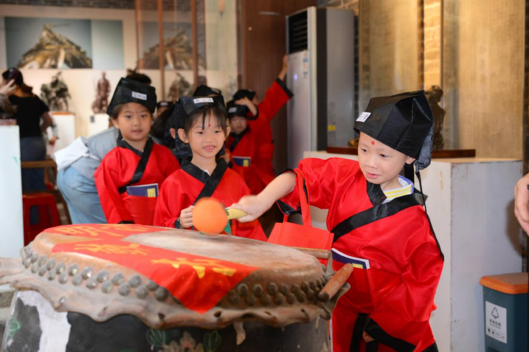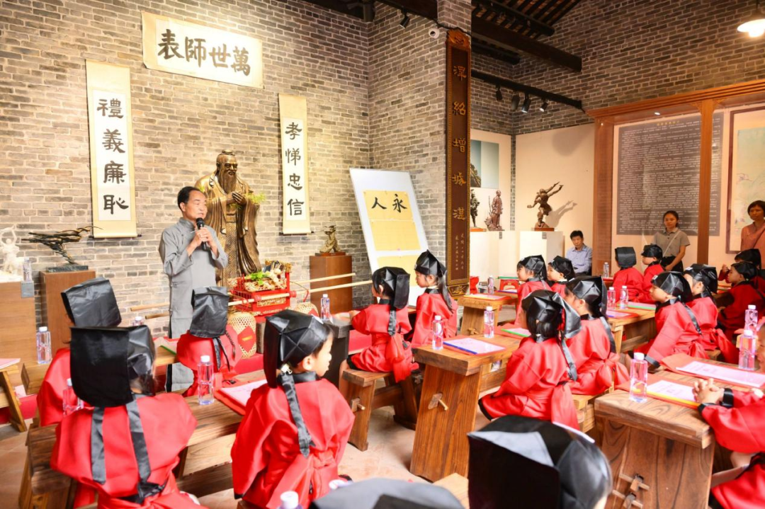 在社学正堂,学童们聆听了传统三本红皮书、葱蒜芹菜与薄撑的美好寓意,了解永新社学的历史故事,在文化熏陶中厚植本土情怀。随后,拜孔子、敬先贤、敬村贤环节庄重举行。学童们在老师的示范下学习交叉手拱手礼,三拜先师,感悟尊师重道的传统美德。在陈宜喜老师的引导下,学习勤、礼、孝的传统品德与科学的学习方法。