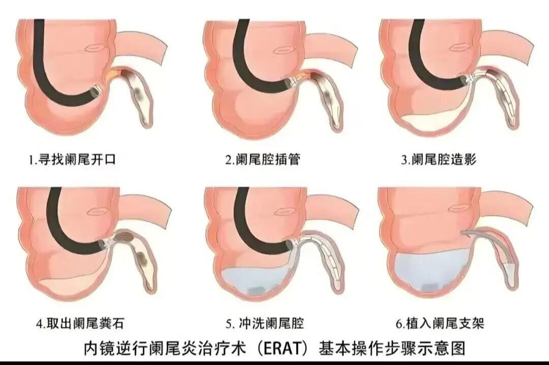 与传统从肚皮上开刀(哪怕是微创的腹腔镜)不同,ERAT手术是经人体自然腔道(肛门)进行操作。医生利用结肠镜,在清晰的内镜视野下,精准找到阑尾开口,通过插管、造影、引流、冲洗等微创操作,对阑尾腔内的粪石、脓液进行清除,从而达到快速消除炎症、保留阑尾的目的。