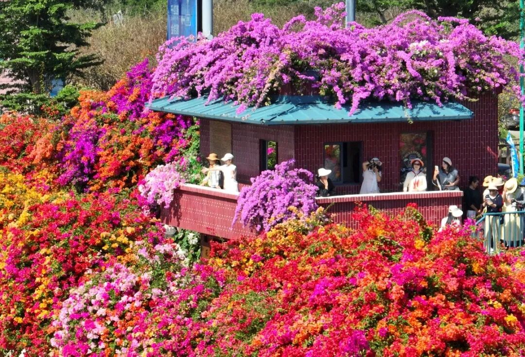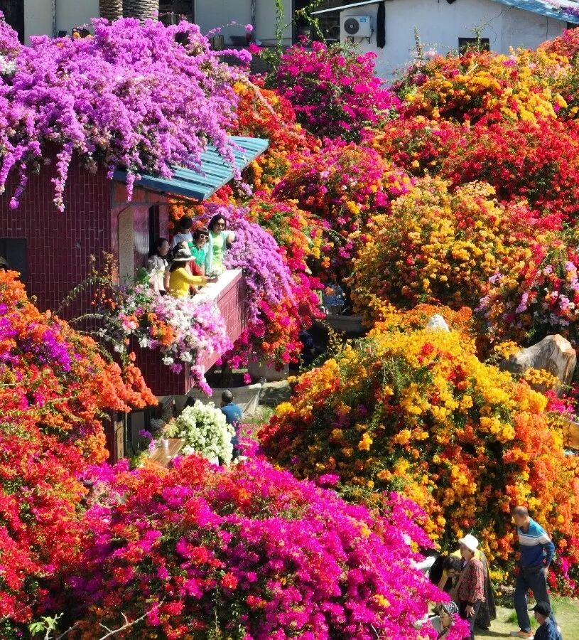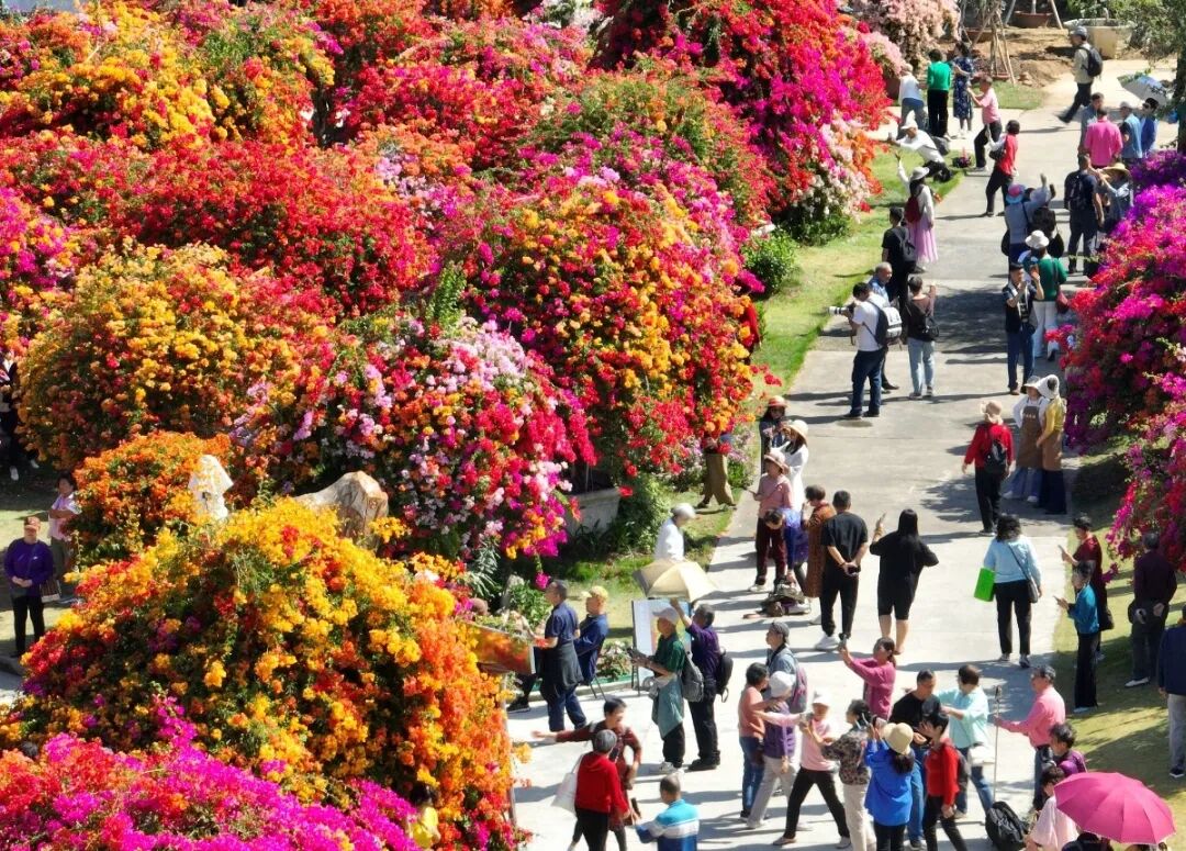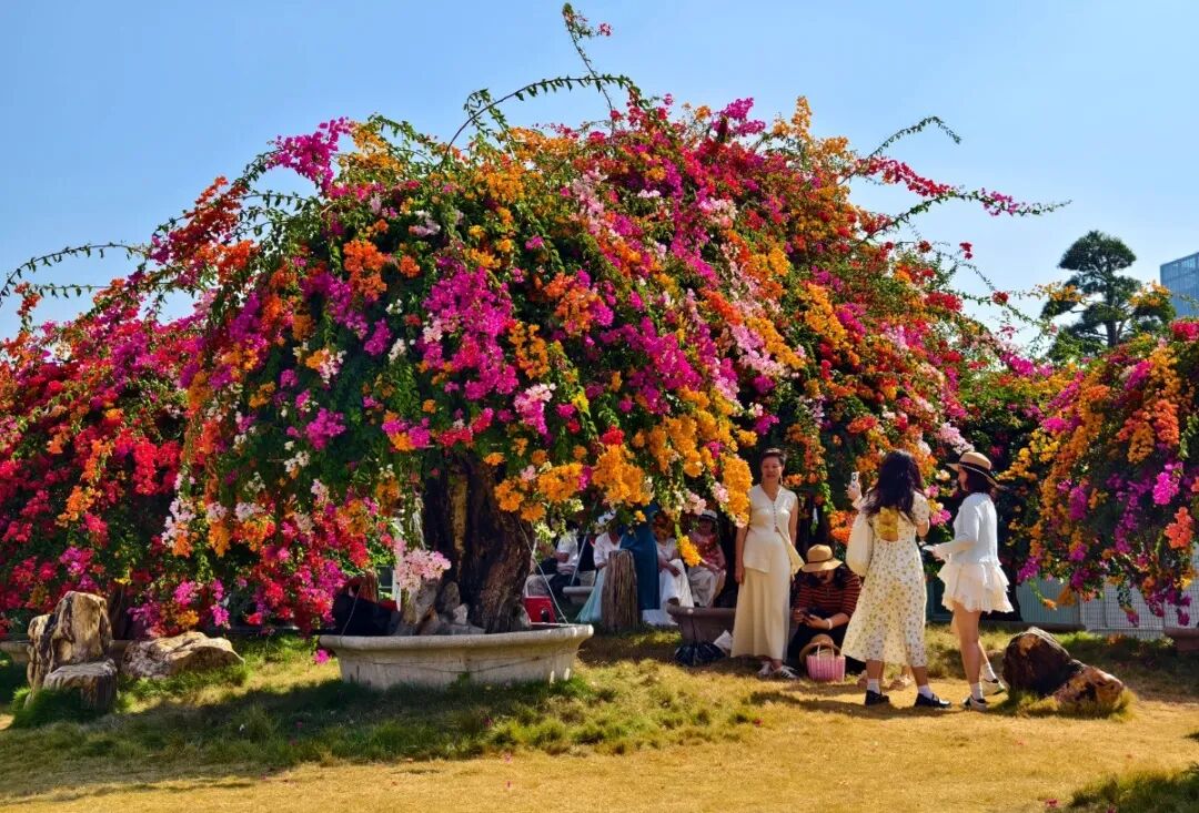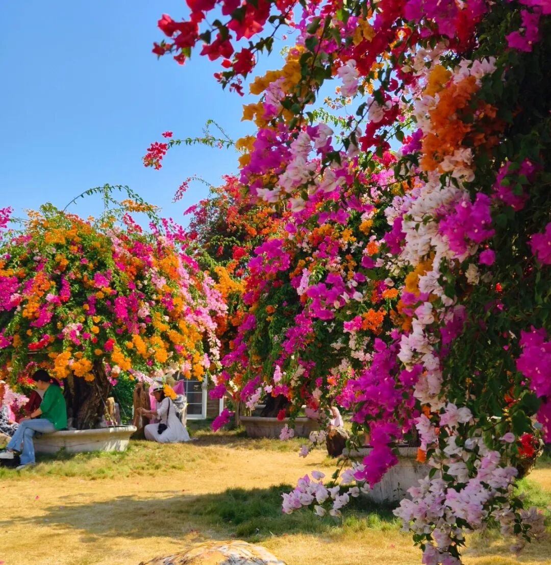 五雀三角梅一树花开如瀑布,热烈而又张扬。园内的泰国五雀三角梅古桩树龄达150-300年,加拿利海枣树龄50-100年,堪称植物界的“活化石”。游客可在此拍摄美学大片、参与植物科普研学,感受“一树一景皆匠心”的园艺魅力。