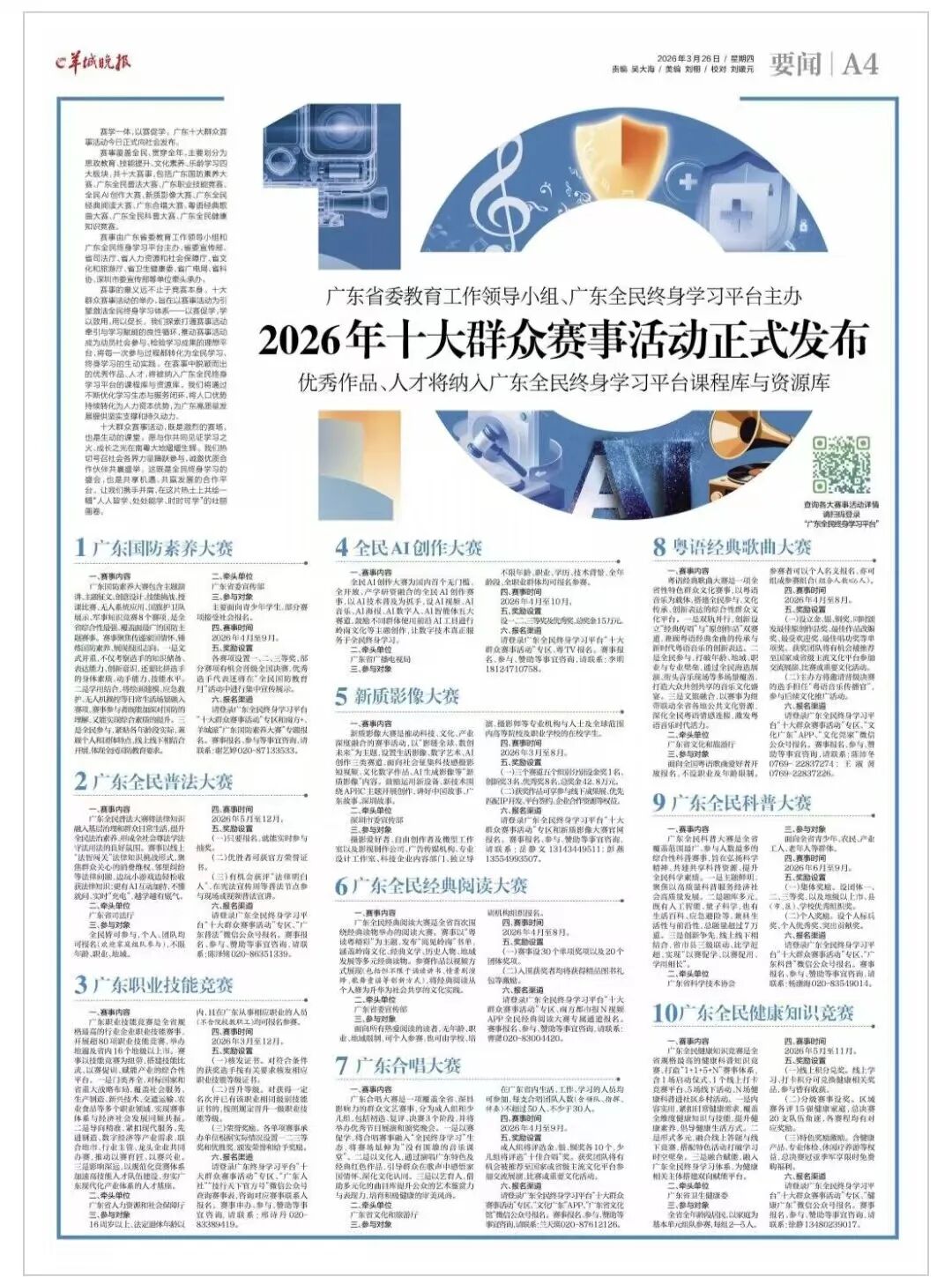3月26日,广东省委教育工作领导小组、广东全民终身学习平台主办的2026年十大群众赛事活动正式亮相,为广东全民终身学习持续赋能。此次公布的十大赛事覆盖全民、贯穿全年,充分体现了广东“终身学习、人人出彩”的核心追求。