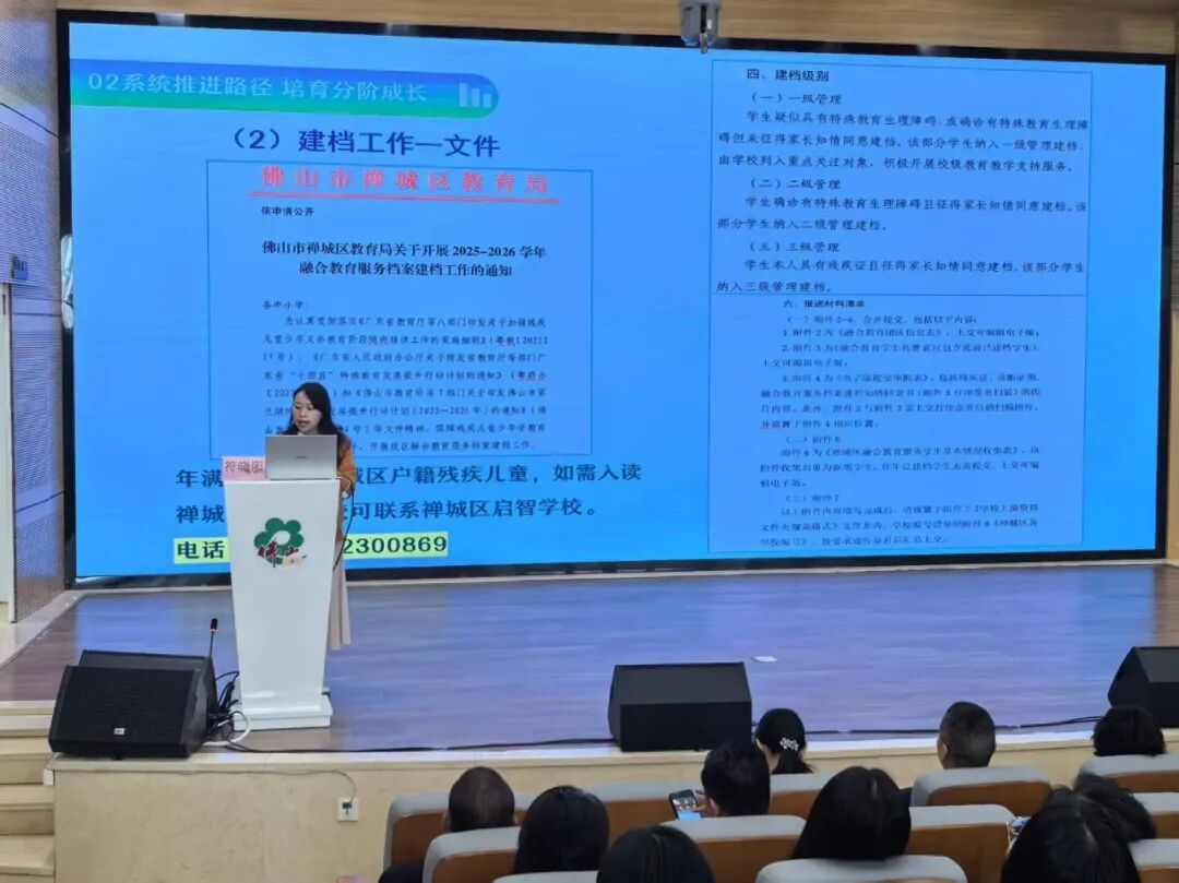 符晓阳以《聚力协同育人,深化融合发展》为题,解读禅城区融合教育支持体系建设思路,并对新学期融合教育工作作出全面部署。她指出区域已构建多部门协同的支援服务架构,针对新学期工作,也提出三项核心要求: