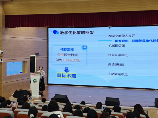黄老师结合本校融合教育课堂教学案例,直面学情不清、目标不定、反馈不畅三大教学困境,详细介绍了依托区级专业支持建立的教学策略,通过课程本位评估精准把握学生能力,发挥学生视觉记忆、机械记忆等优势,分层设定可测可达成的教学目标,设计适配性教学活动,并以替代性评价、贴纸反馈等方式实现教学效果全程追踪,同时借力校级团队与区级资源教师协同磨课,打造了《敕勒歌》等优质融合教育课例,为全区小学融合教育课堂教学实践提供了鲜活参考。