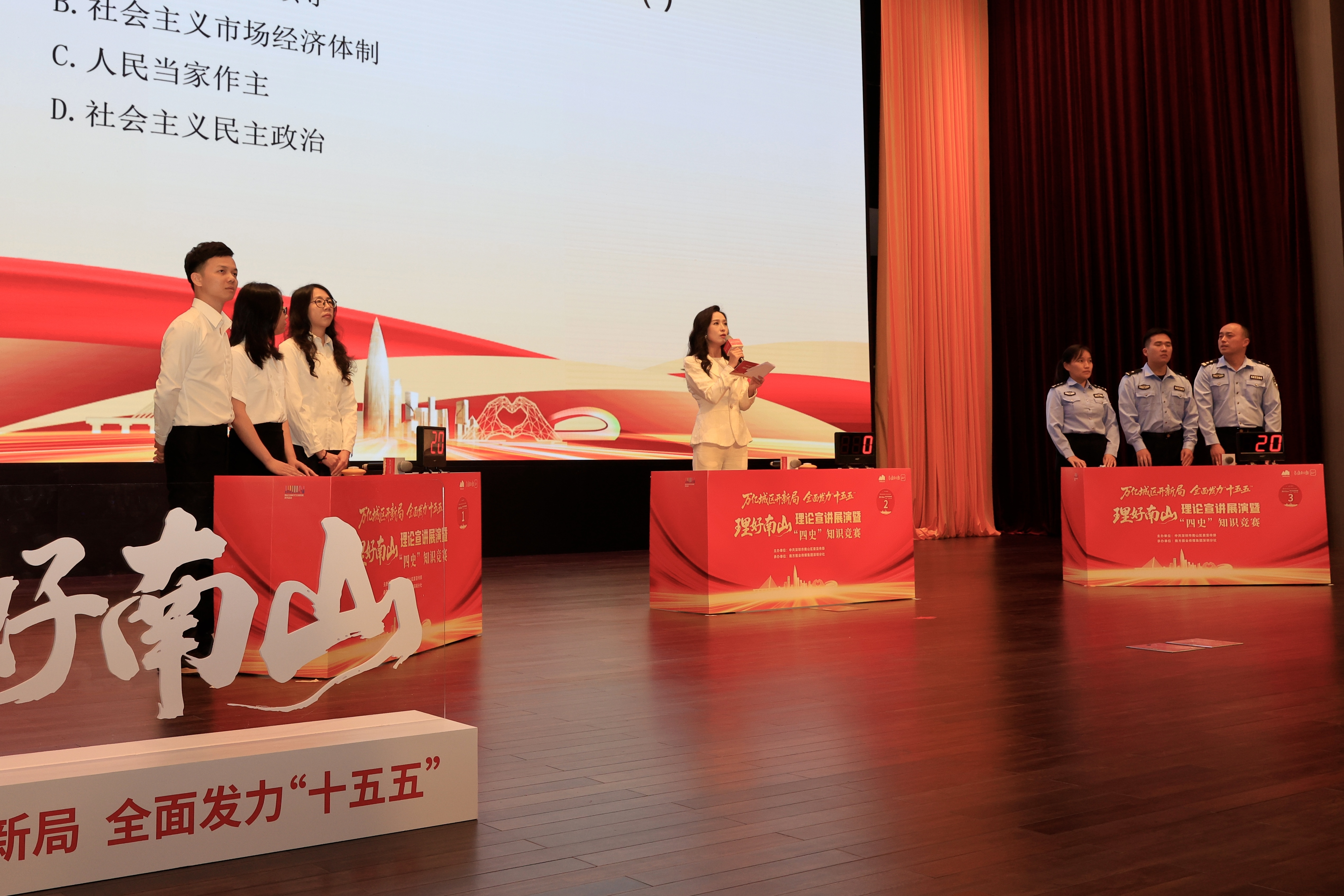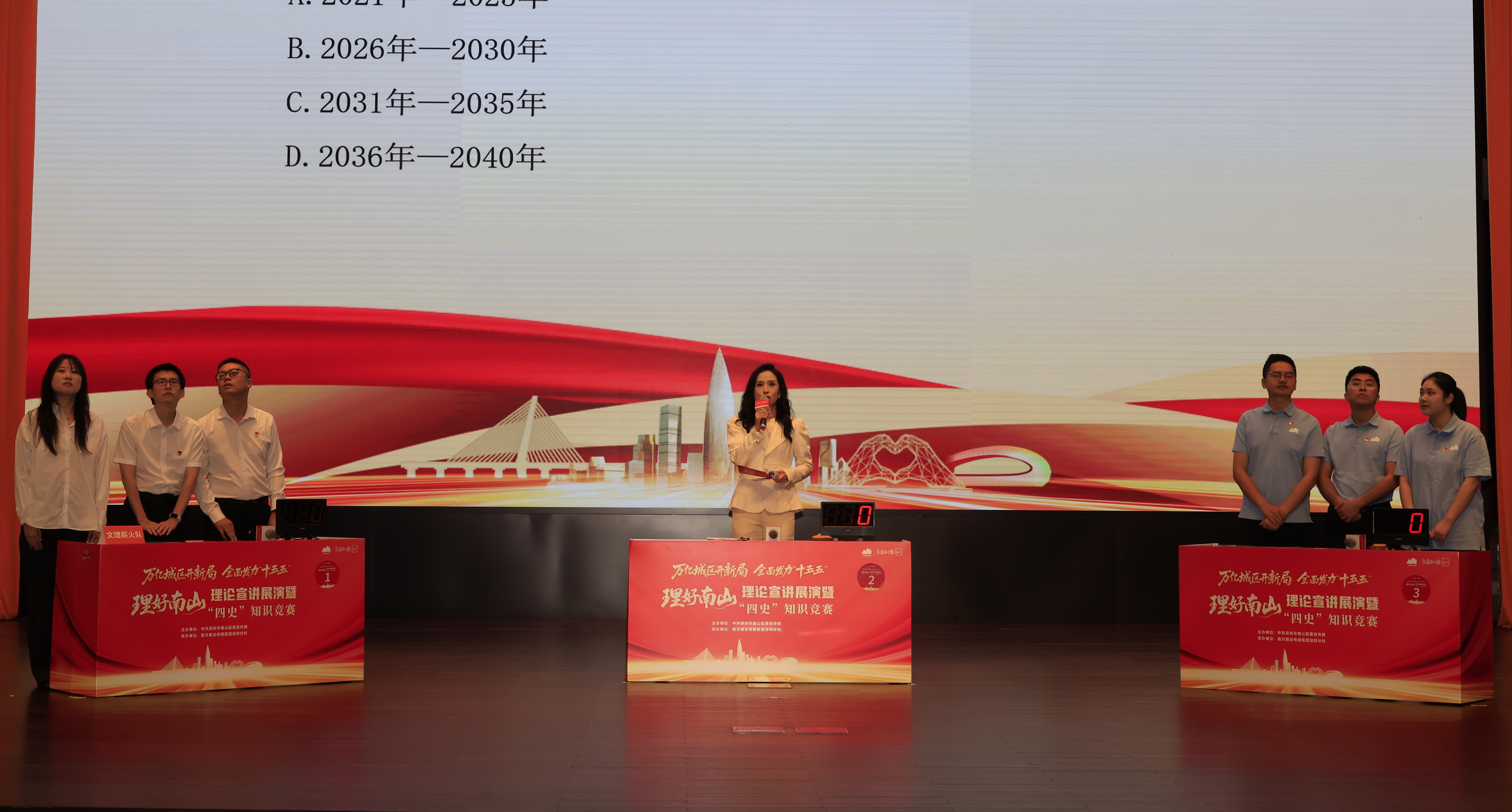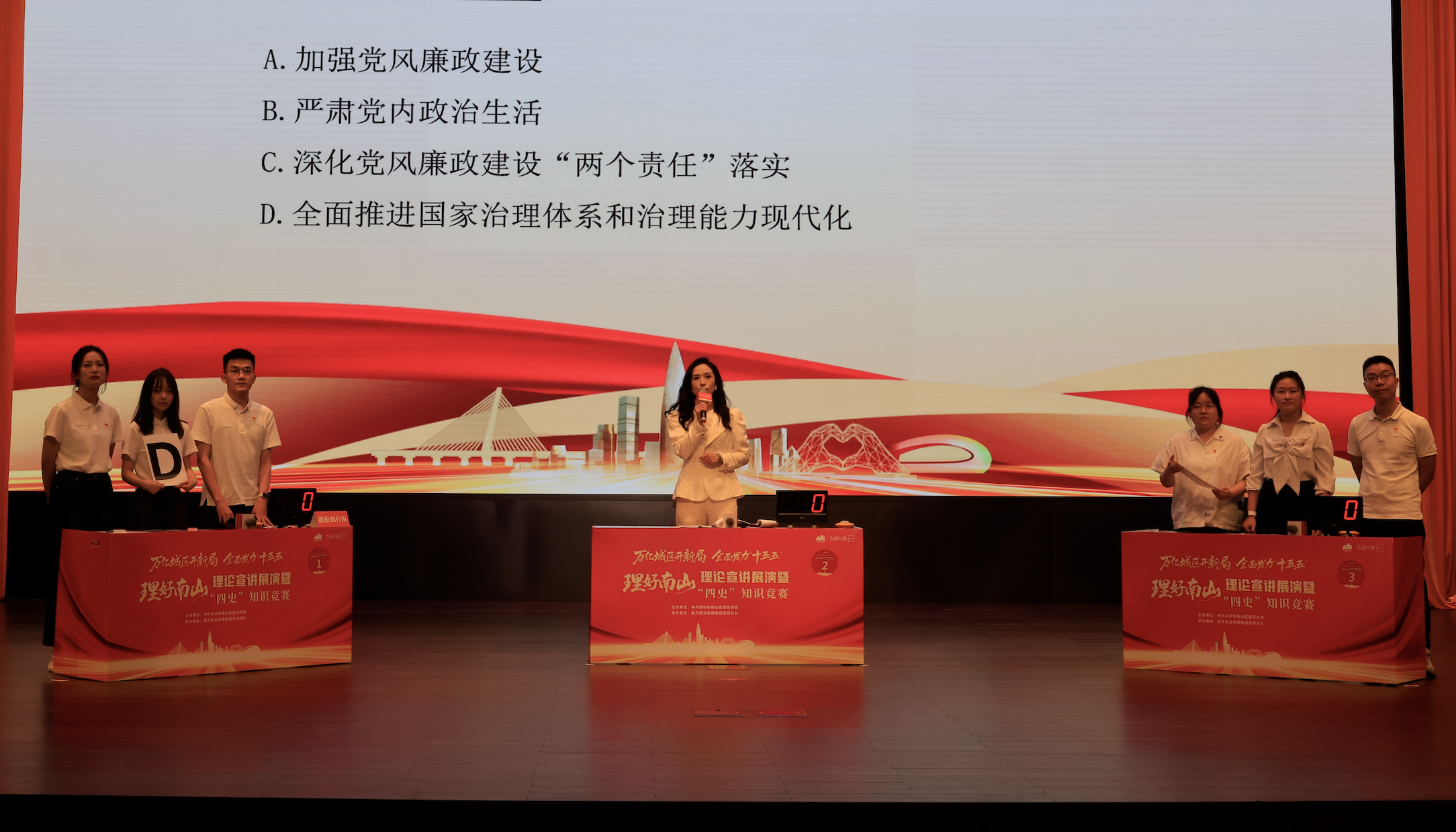 理论宣讲之后,“四史”知识竞赛火热开赛。经过线上初赛的选拔,来自南山区妇幼保健院、南山区委教育工委、大沙河建投公司、南山区人民法院、南山区财政局(国资局)、南方科技大学医院的6支队伍会师决赛。