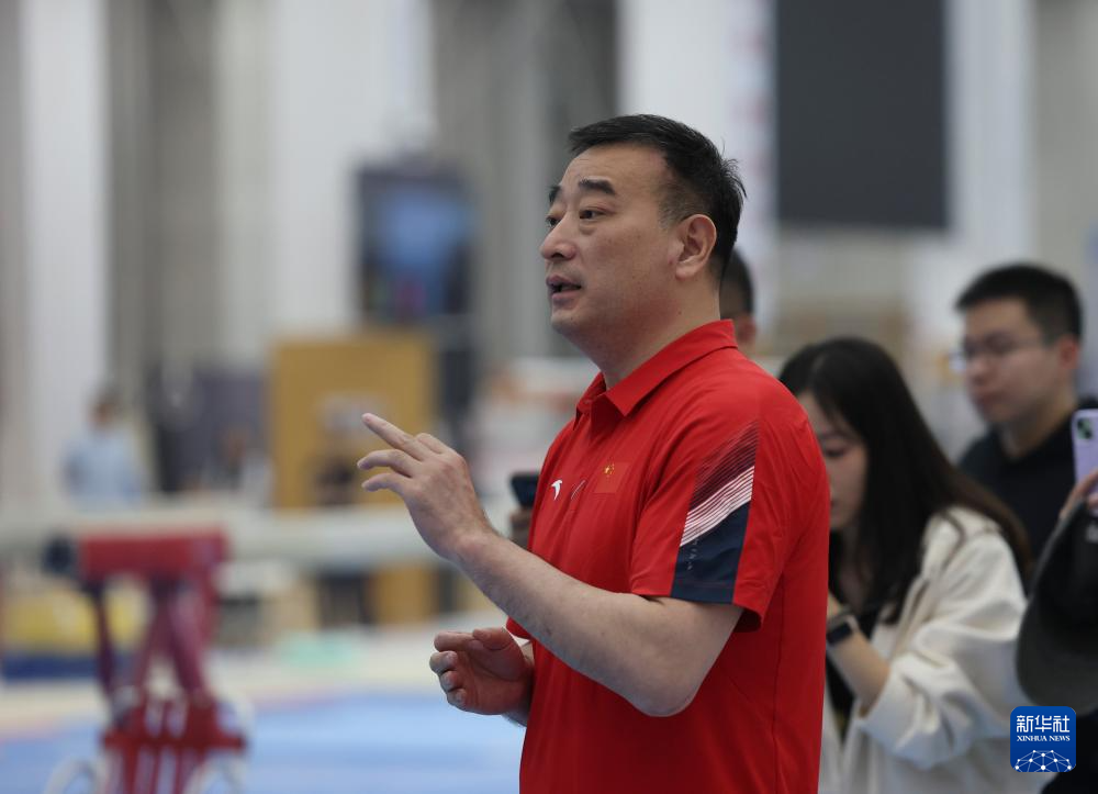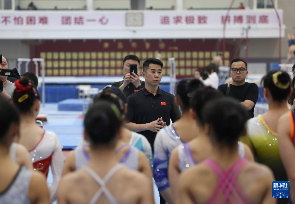 3月26日,中国国家体操队领队陆斌在测试后和队员们交流。