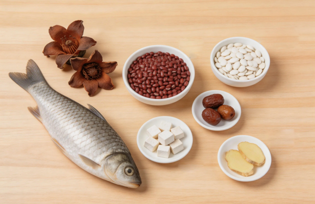 干木棉花8-10朵、鲫鱼1条、赤小豆15g、茯苓15g、白扁豆15g、蜜枣2颗、姜3片。