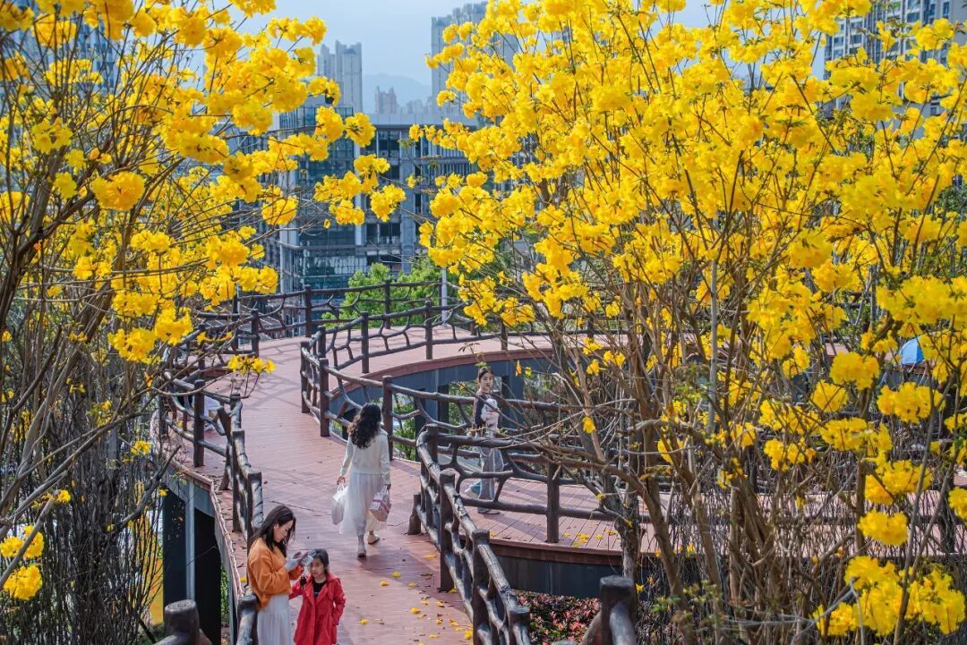 3月25日,江西赣州,于都县儿童公园黄花风铃木迎春盛放。