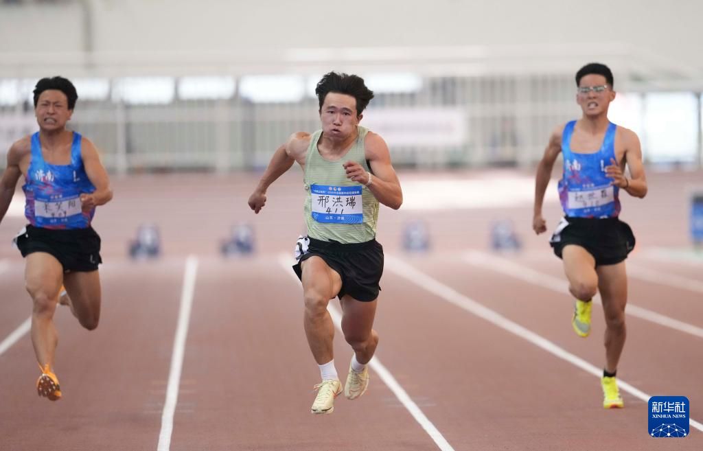 3月27日,山东(测验)队选手邢洪瑞(中)在男子60米预赛中。