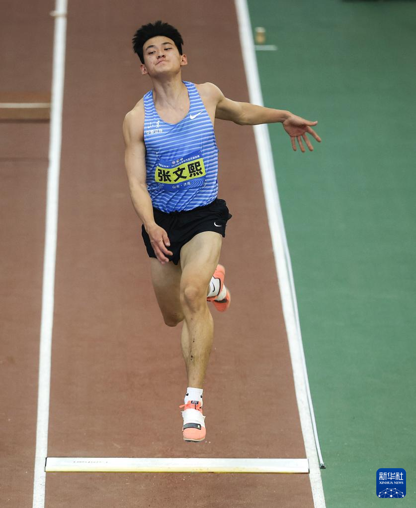 3月27日,山东中泰证券队选手张文熙在男子七项全能跳远比赛中。