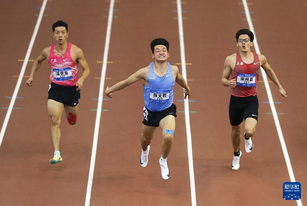 3月27日,山东中泰证券队选手张文熙(中)在男子七项全能60米比赛中。