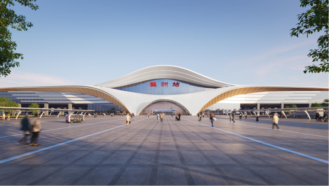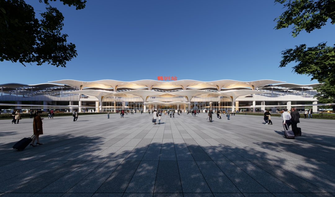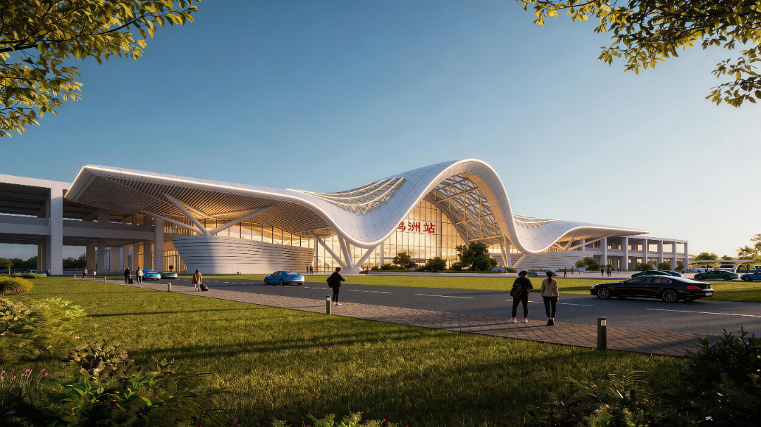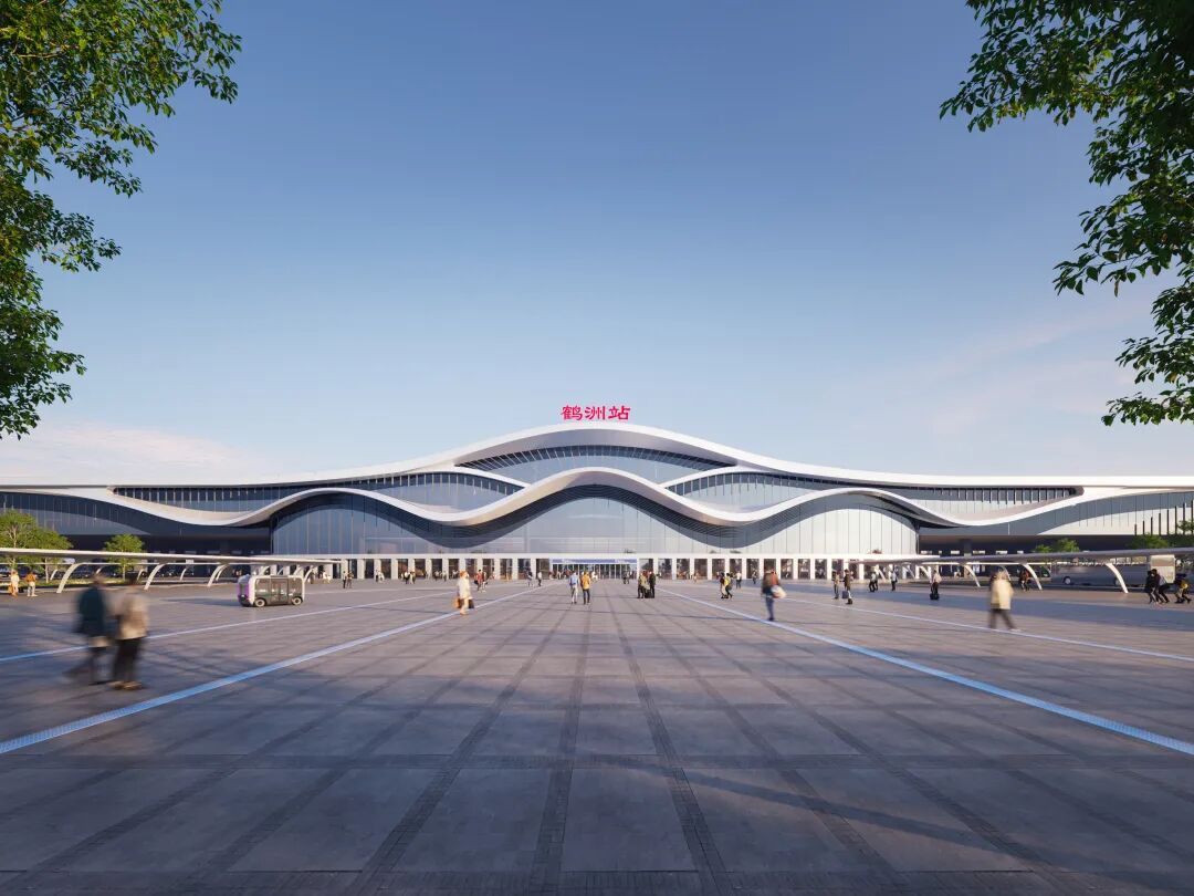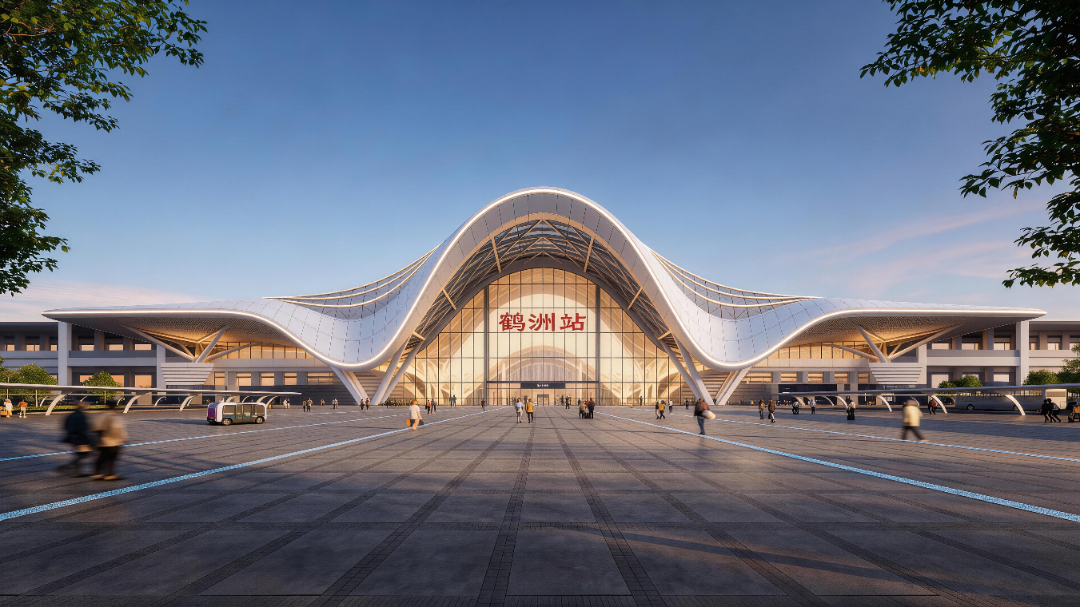 方案以舒缓流动的曲线模拟仙鹤起舞的优雅身姿,通过开敞通透的界面模糊建筑与城市的空间边界。设计将站房由封闭的交通节点转化为缝合城市肌理的活力触媒,使枢纽功能与公共生活发生深度渗透与无界交互,寓意鹤洲站将不再仅仅是出行的终点,更是驱动城站一体、共生共荣的活力磁场。