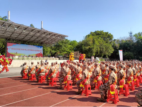 又是一年送兵季,热血男儿赴军营。3月14日上午,2026年上半年广州市天河区新兵入伍欢送大会在中国人民警察大学(广州校区)隆重举行。在激昂的军歌声中,五山街道三名优秀青年身着戎装、胸戴红花,肩负家乡人民的殷切期望和真挚祝福,即将奔赴火热军营,开启保家卫国的光荣征程。