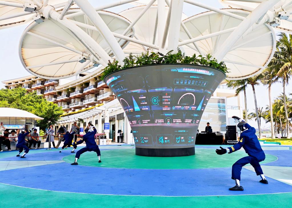 3月24日,来自宇树科技的人形机器人在博鳌亚洲论坛年会会场为宾客表演功夫秀。 新华社记者 白阳 摄