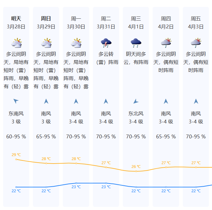预计28-30日大致多云,早晚有轻雾或雾,间中偶有阵雨;