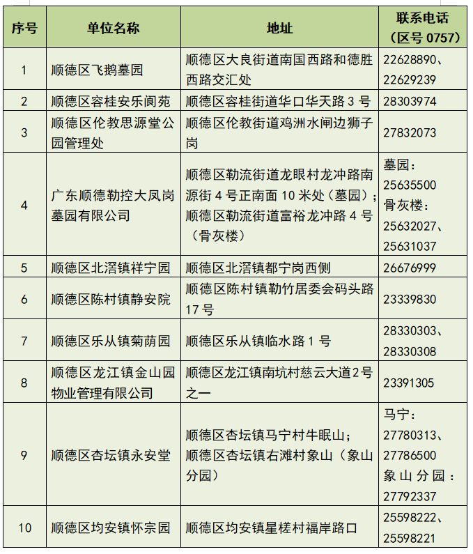 2026年清明节将至,为充分满足市民群众的祭扫需求,持续深化我区殡葬改革成果,有效防范山火及安全事故,切实保障全区人民生命财产安全,依据《佛山市顺德区人民政府森林防火禁火令》,结合我区清明节工作具体部署,今年清明期间,我区各殡葬服务机构将全面推行“文明祭扫”,倡导以一束鲜花或一炷清香缅怀先人、寄托哀思。现将有关事项通告如下: 请广大市民积极配合我区殡葬服务机构(各公墓、骨灰楼(堂))的安全疏导工作,合理规划拜祭路线与时间,错峰前往祭扫。2026年清明节期间,我区各殡葬服务机构无需预约,按日常安排正常提供祭扫服务。 自4月4日至4月30日清明节期间,依据相关规定,我区殡葬服务机构内倡导“文明祭扫”。市民可手持一炷清香,庄重悼念先人、追思亲人,同时大力倡导以一束鲜花践行绿色文明祭扫方式。在公墓、骨灰楼(堂)等殡葬服务场所内,严禁任何人燃烧鞭炮、蜡烛,焚烧冥币纸钱、纸扎物等各类丧葬祭祀用品。请广大市民积极配合殡葬服务机构工作安排,以及祭祀用品的检查。若市民发现违法违规燃烧祭祀用品等行为,请立即向区殡葬服务中心或区应急管理局举报。区殡葬服务中心举报电话:22831085;区森林防灭火指挥部办公室(区应急管理局)电话:12119 。 清明节期间,严禁在山林、耕地、杂地、荒地及其他公共区域重立坟墓;严禁进行骨灰土葬。市民若发现重立坟墓等行为,请及时向区殡葬服务中心举报(举报电话:22831085)。 为方便市民在清明节期间祭扫,飞鹅墓园将于4月5日6:00 至17:30开通9条往返飞鹅墓园的免费公交专线,具体线路起始站点如下:大良(锦上路云阳路口、顺德客运总站、延年路、顺德体育中心、原大良凤翔机动车驾驶员训练场);容桂(胡锦超职业技术学校、新世纪花园公交站、马冈大道中);伦教(木工机械城)。并于4月6、11、12日9:00至16:00持续开通1条大良延年路往返飞鹅墓园的免费公交专线。 (温馨提示:各条专线中途不设上落客点。请市民在各站点附近的社会车辆停车位有序停放车辆。德胜西路飞鹅路段及大门路段公交专用道禁止其他车辆进入。) 此外,4月5日北滘镇祥宁园、陈村镇静安院也将开通免费公交专线。北滘镇将于7:00时至14:20开通1条往返祥宁园的临时免费公交接驳专线,具体线路起始点如下:中山公园站、南源花园站、祥宁园,每15分钟一班;陈村镇将于7:00时至17:30时开通1条往返静安院的临时免费公交接驳专线,具体线路起始点如下:顺联机械城、地铁7号线陈村北站、静安院,每5-10分钟一班。 在此,我们呼吁广大市民积极响应绿色出行倡议,优先选择专线公交车或其他公共交通工具前往祭扫现场,尽量减少自驾车出行,共同营造文明、便捷、有序的祭扫环境。 若对祭扫安排、交通线路等有疑问,可拨打相关祭扫场所咨询电话。温馨提醒市民关注相关通知公告,文明有序完成祭扫活动。 特此通告。 附件:顺德区2026年清明节祭扫场所咨询电话 佛山市顺德区民政和人力资源社会保障局 2026年3月26日