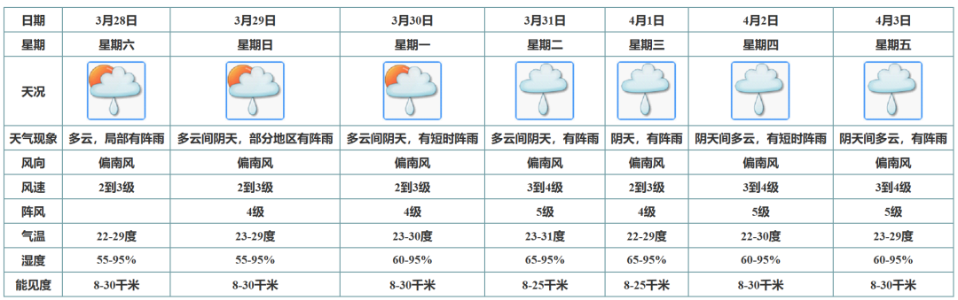 预计新会区3月28日多云,局部有阵雨;3月29日至4月3日多云间阴天,有阵雨。