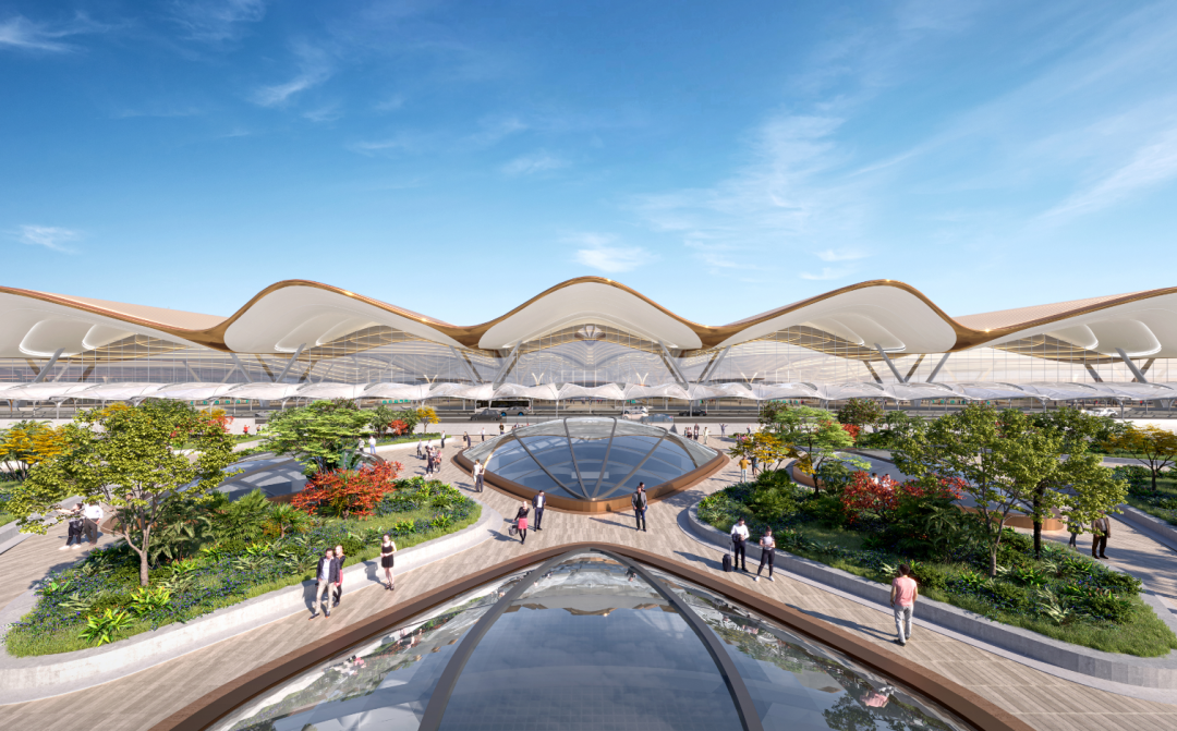 机场总体呈现醒狮意象,航站楼灵感来源于粤剧头饰状元冠。