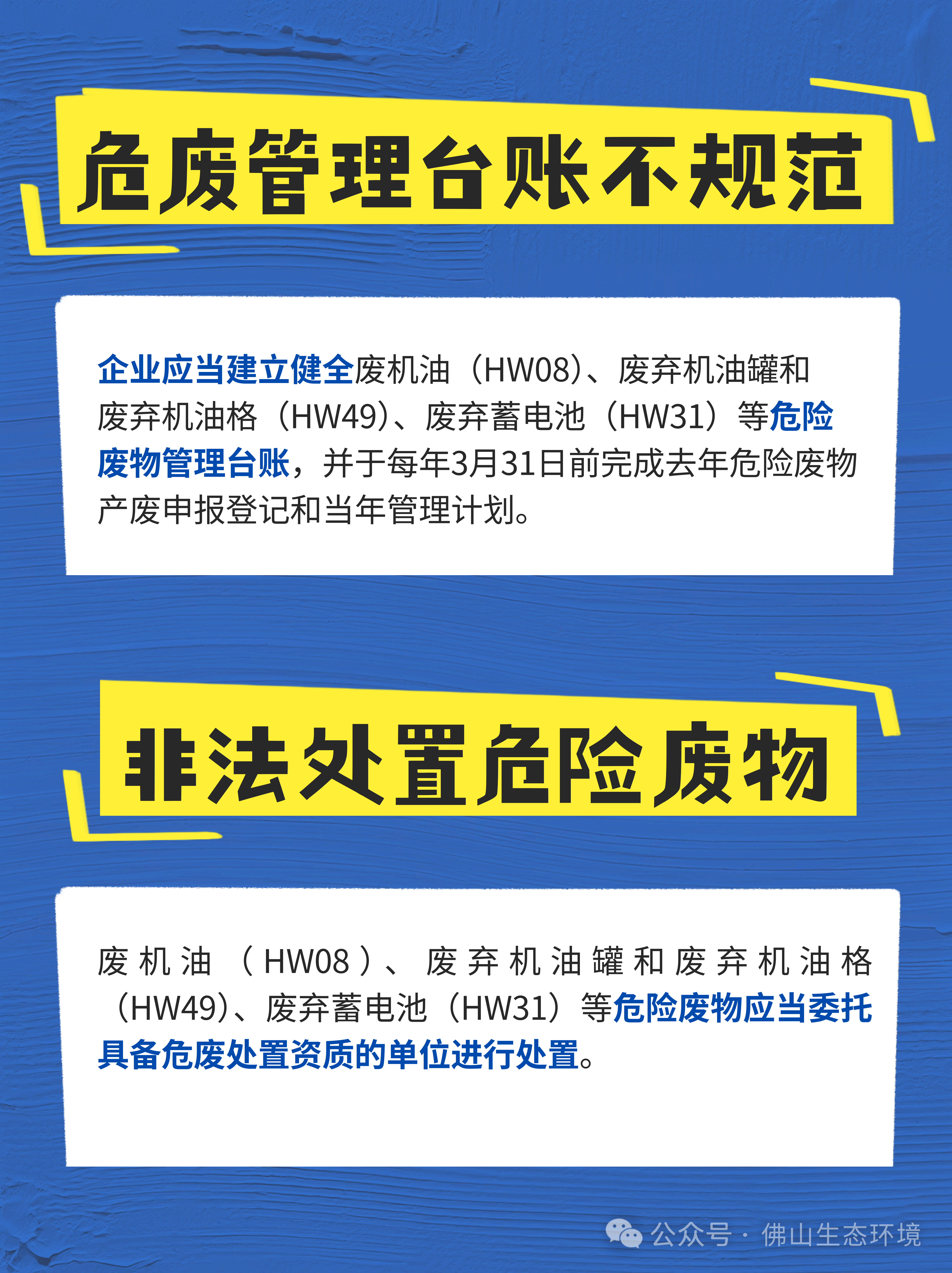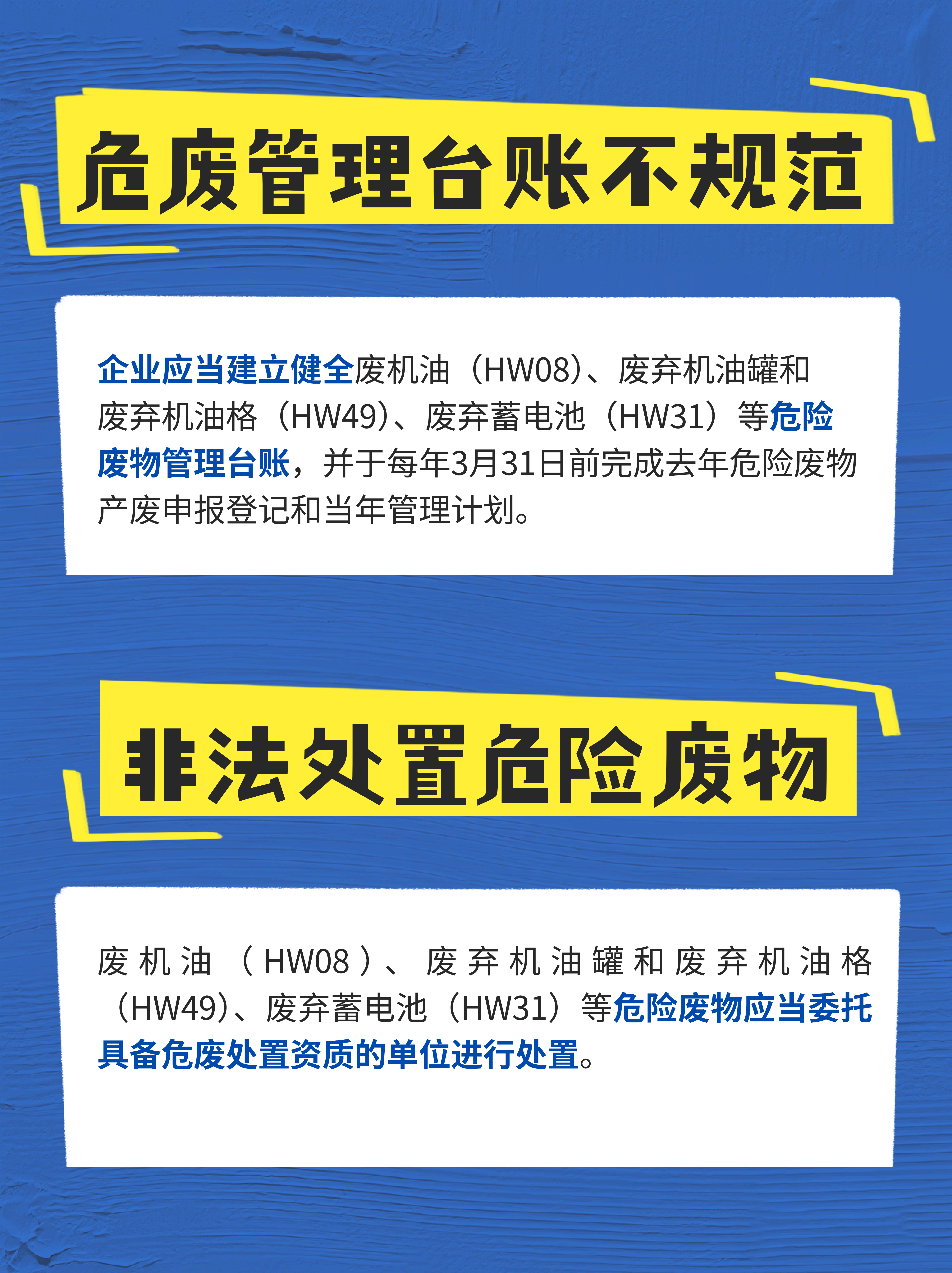 钣金喷涂有什么环保要求?废机油、废弃机油罐、废弃机油格、废弃蓄电池又应该怎样贮存处置?为帮扶服务汽修企业全面系统掌握环保要求,环境君整理了汽修行业常见环境违法风险,请相关单位注意防范和整改!