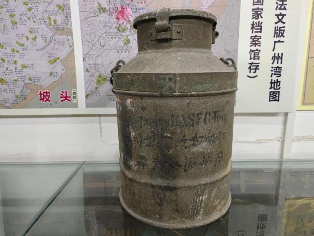 在时间的洗礼下,染料桶上的大部分文字已经变得模糊不清,但依然可以窥见桶上的“BASF”“优等”等字样。彼时,胡贤光并不知道其具体来历,并将它放置在广州湾历史民俗馆内。