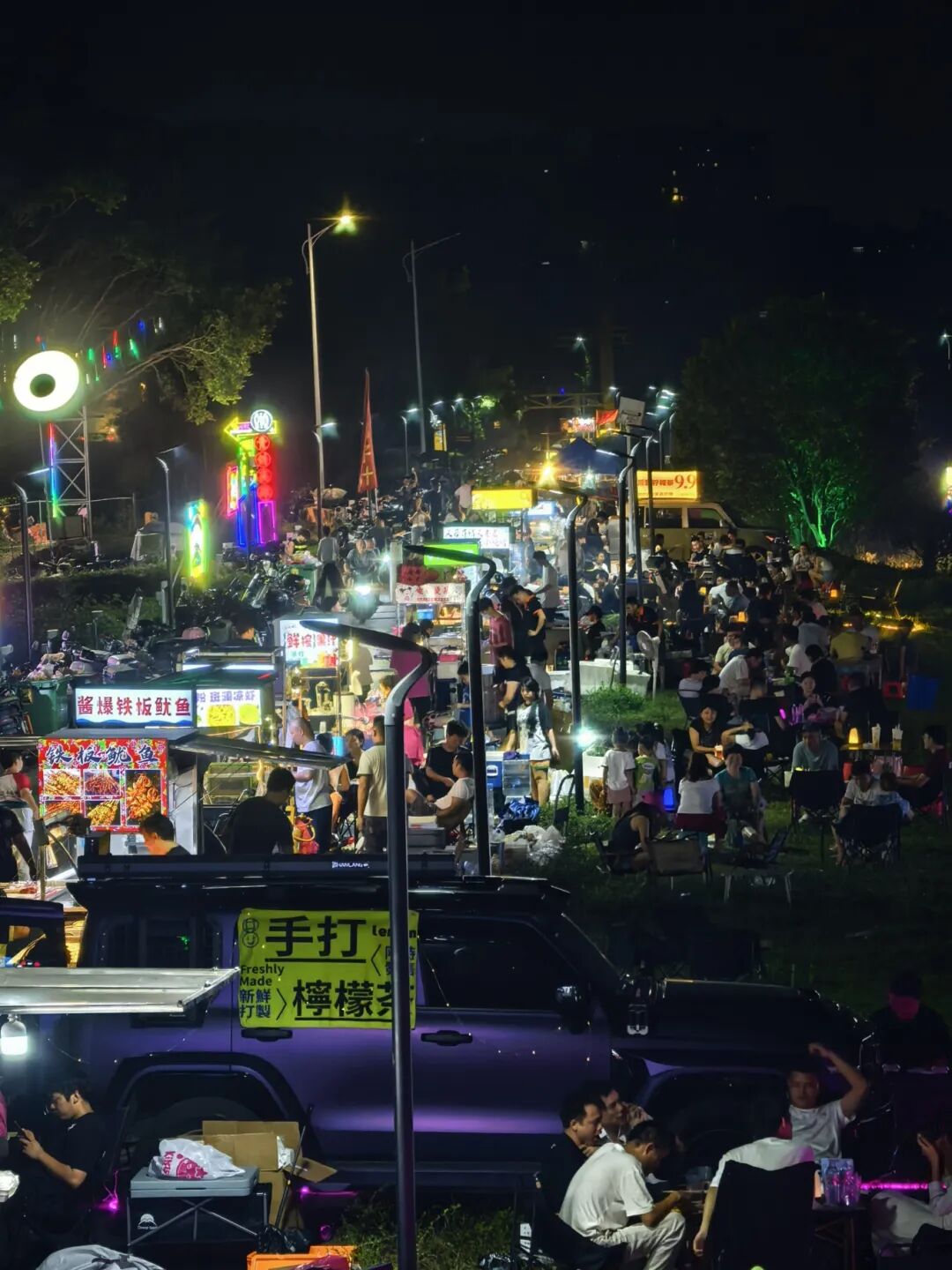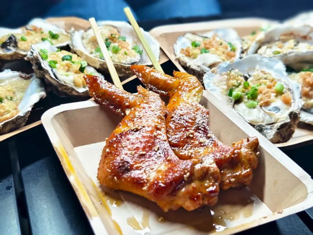 粉面摊前升腾着诱人的热气,烧烤架上食物滋滋作响,这里串烧对虾、炒粉面、烤鸡翅、烧生蚝、麻辣烫、炸串、茶酒、糖水等美食一应俱全,香味在空气中弥漫,烟火气十足。