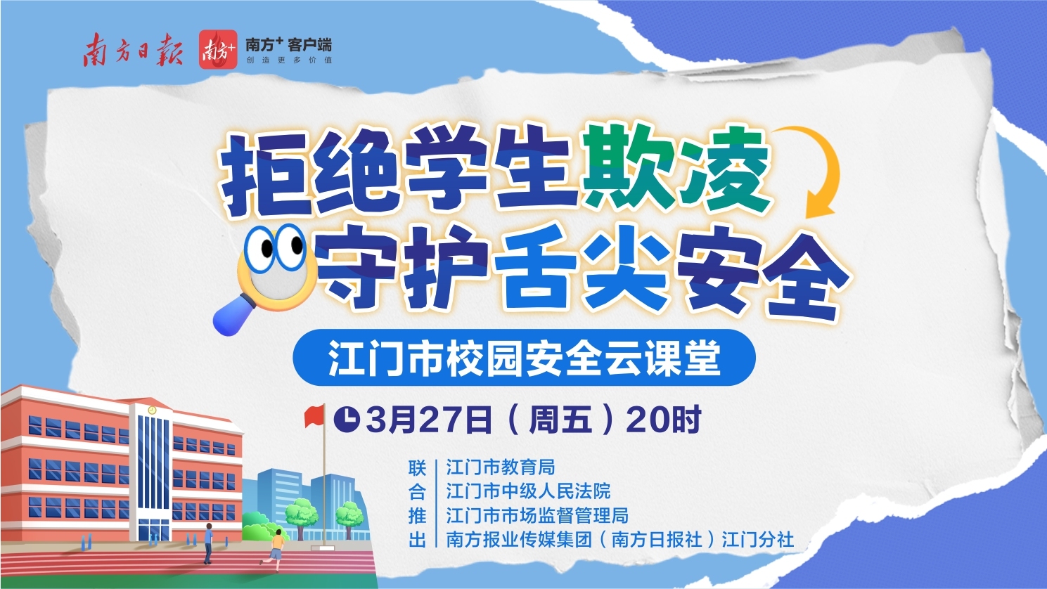 2026年全国中小学生安全教育日即将到来,为筑牢校园安全“双防线”,提升家长、学生的防欺凌自我保护意识和食品安全素养,江门市教育局联合江门市中级人民法院、江门市市场监督管理局、南方报业传媒集团(南方日报社)江门分社,打造江门市校园安全云课堂,用权威讲解、真实案例,把安全知识送到每一位学生身边。