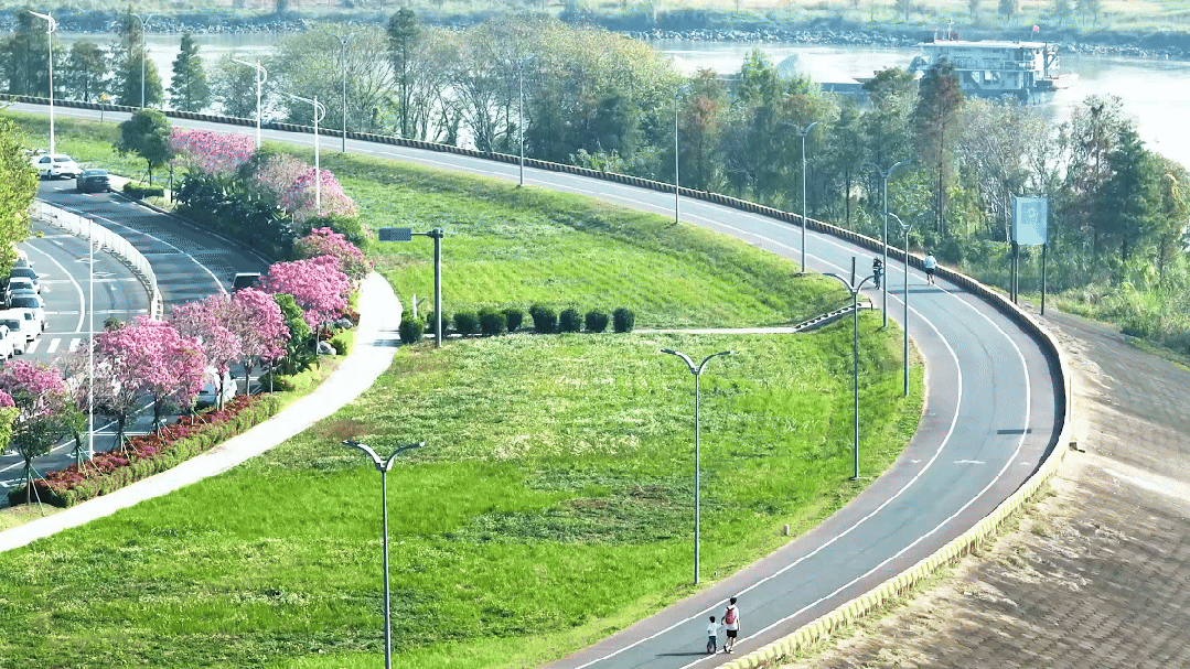 半月岛湿地公园江景开阔、栈道蜿蜒