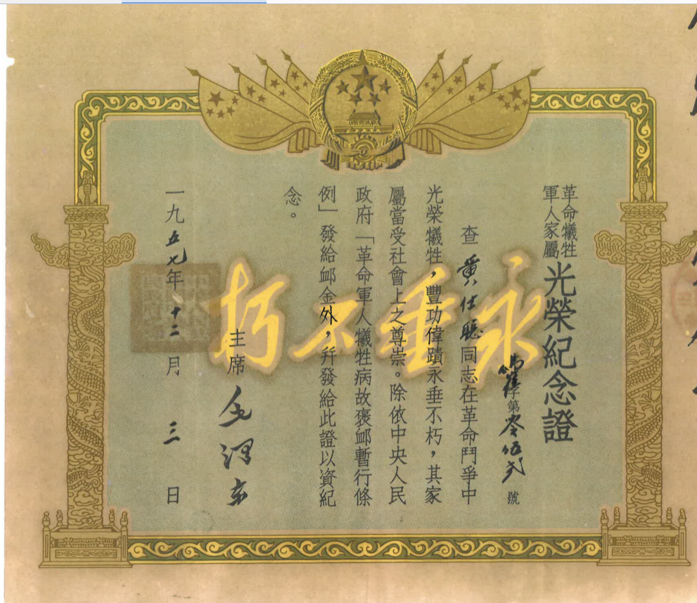 黄仕聪烈士,1936年参加革命并组织武装起义。1944年高明人民抗日游击队第三大队在更楼忠义祠宣告成立,黄仕聪为大队长。1945年1月任广东人民抗日解放军第三团团长,同年12月23日英勇牺牲。这张泛黄的证书,承载着烈士的赤胆忠心,更寄托着烈士亲属几十年的精神寄托。