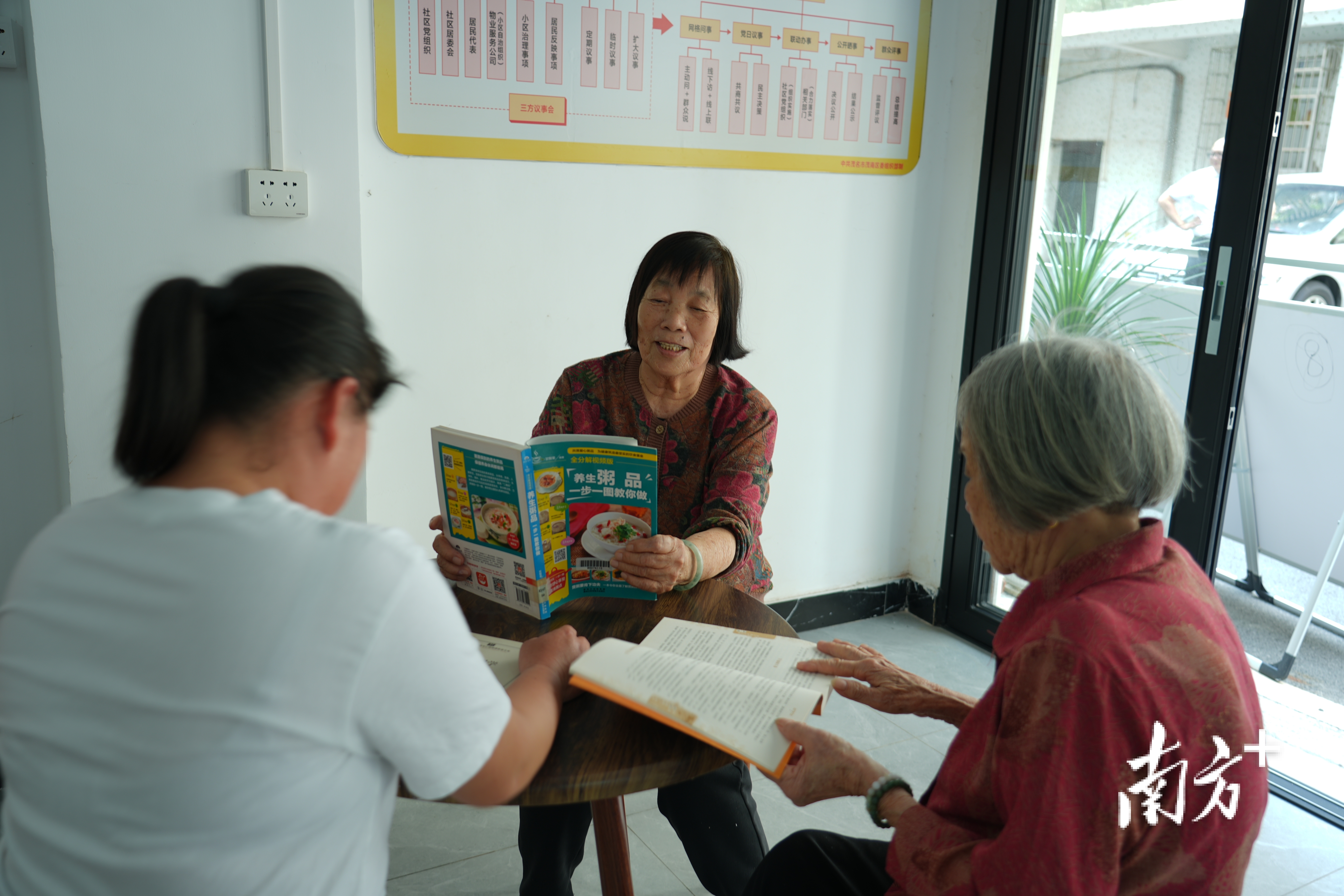 官渡街道“校园小区邻里图书室”,几名居民在翻阅书籍。叶洁 摄