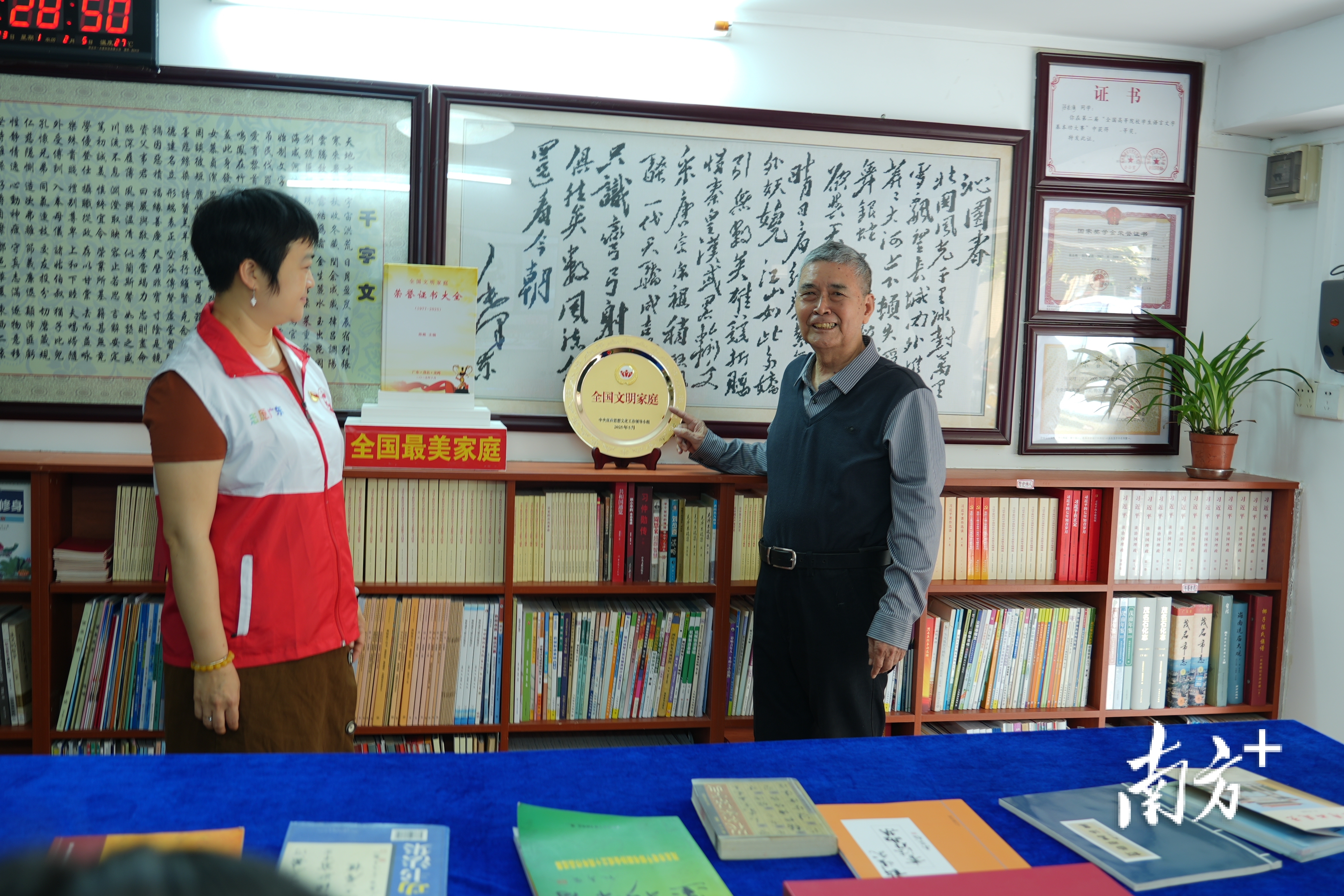 整间书屋以书架为主体,多排实木书架沿墙而立,层层叠叠的书籍分类规整、排列整齐,60平方米的书屋藏书达5000多册。一排书架正中,“全国文明家庭”“全国最美家庭”两块荣誉牌格外醒目。另一面墙的电视,正播放着这个书香之家的感人故事。