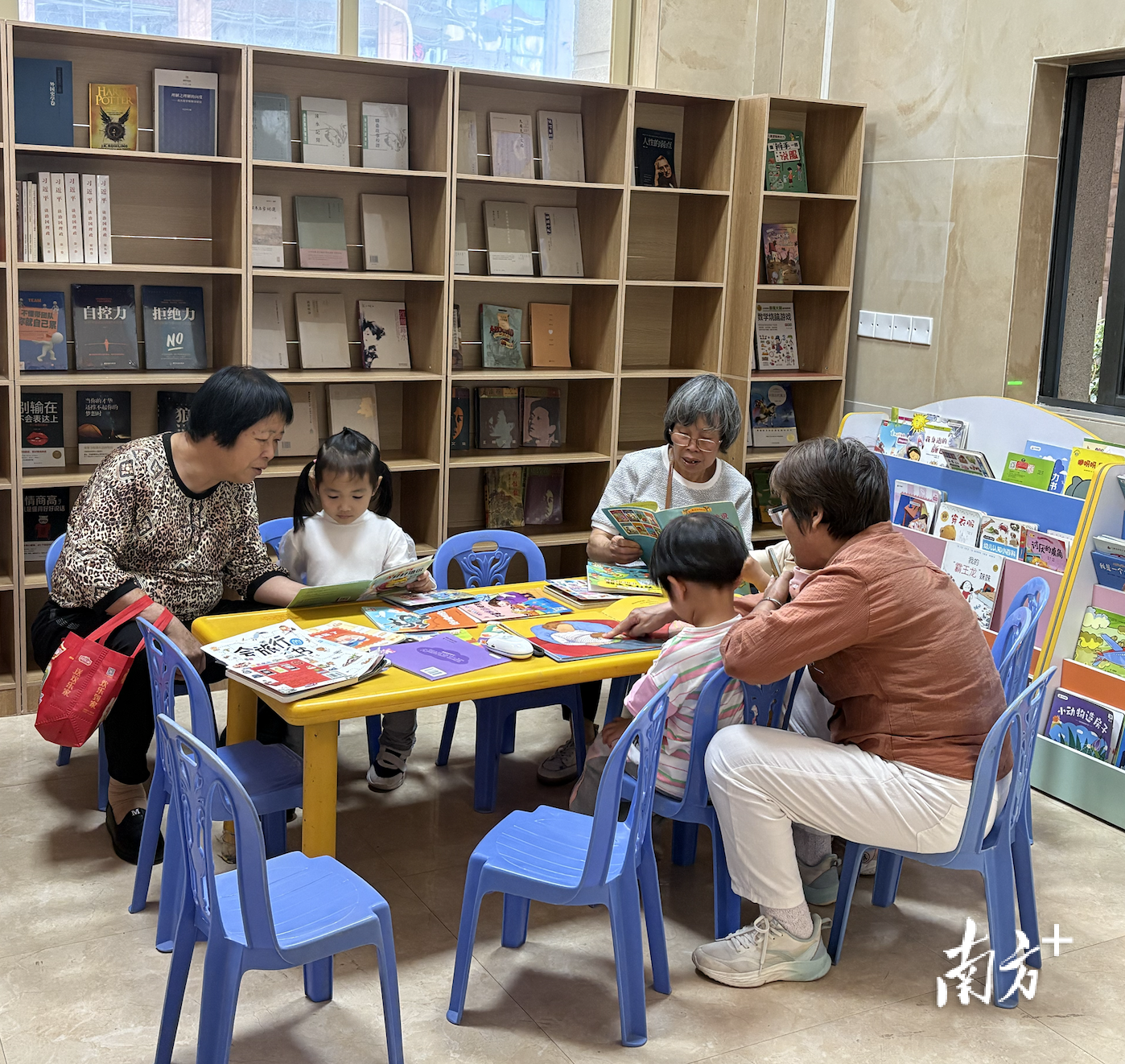 下午5时许,茂南区金源盛世小区“快乐书吧”里,几位老人正带着刚放学的孙辈静静翻阅绘本。书架上,儿童读物与养生书籍比邻而居;窗外,夕阳洒在小区绿地上,一派祥和。
