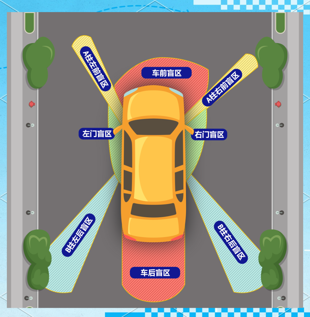AB柱盲区:指的是挡风玻璃两侧的A柱和B柱形成的盲区。