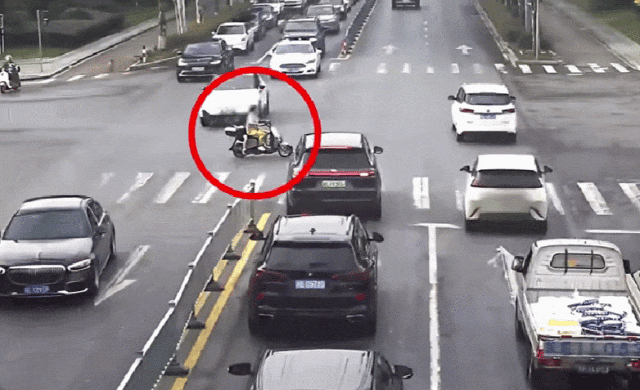 ▲一位老人家驾驶电动自行车送小朋友去上学,行经路口时无视滚滚车流径直闯红灯通行,结果与一辆正常行驶的小汽车发生碰撞。事故造成两车受损。