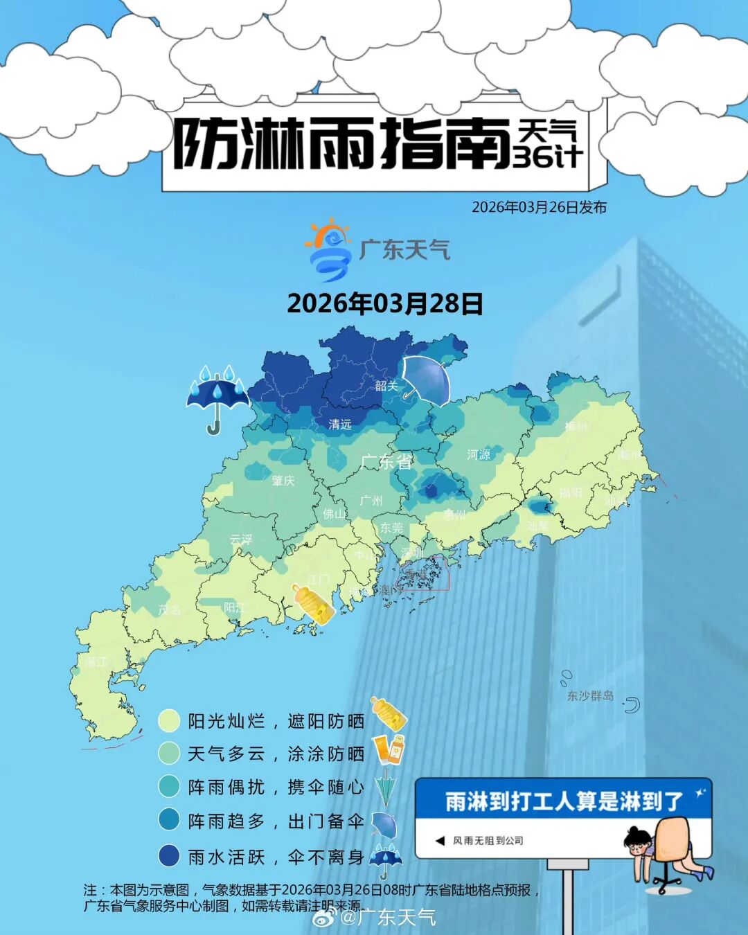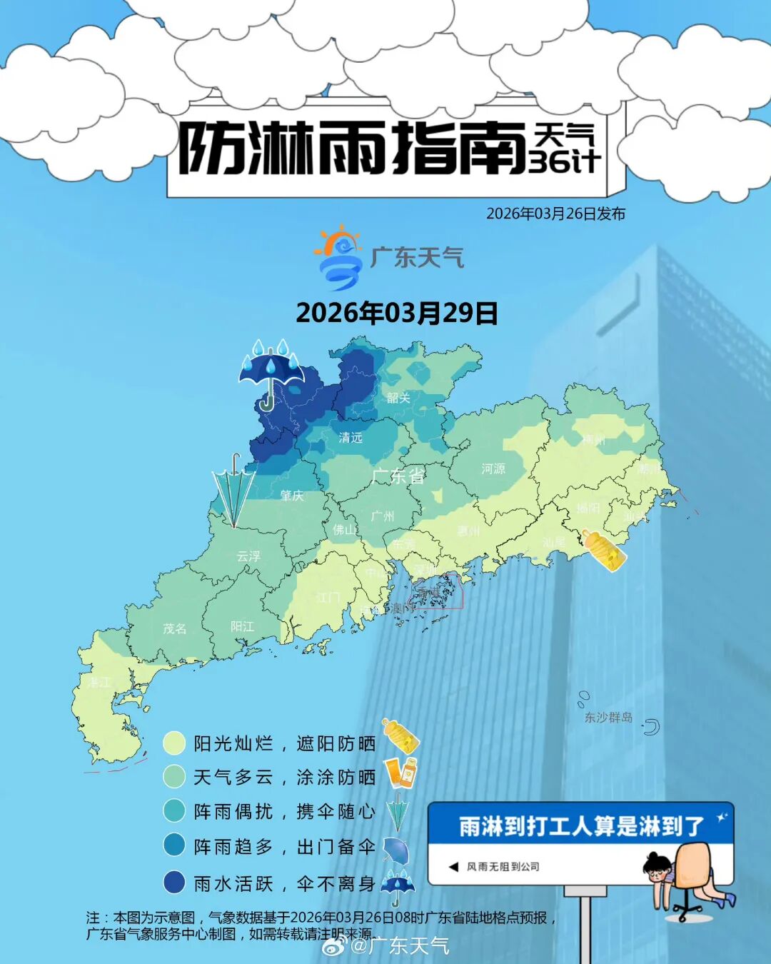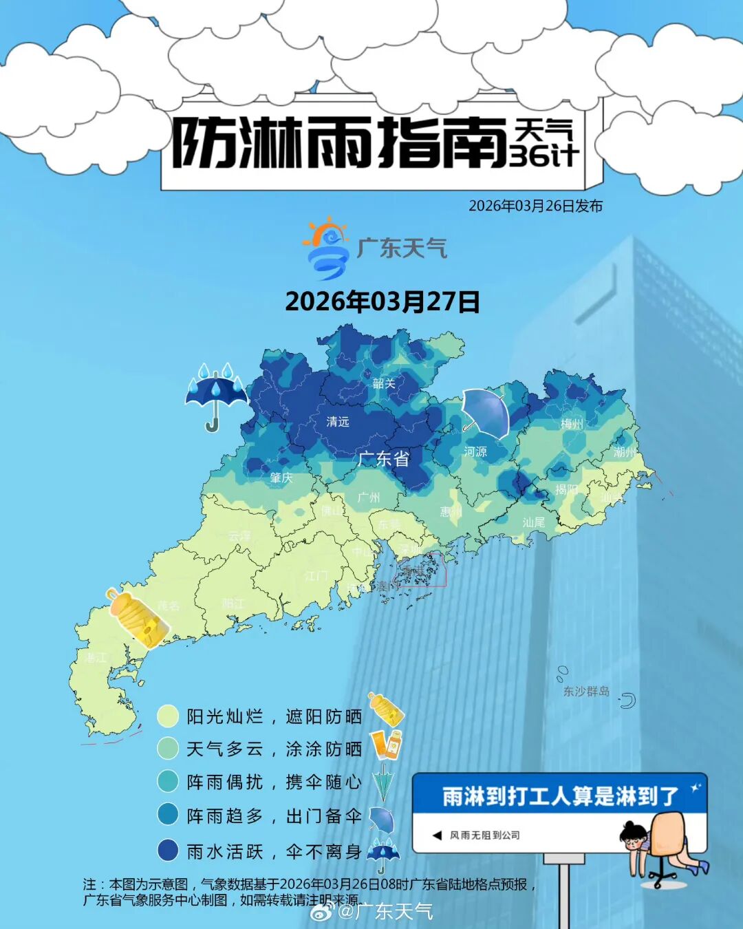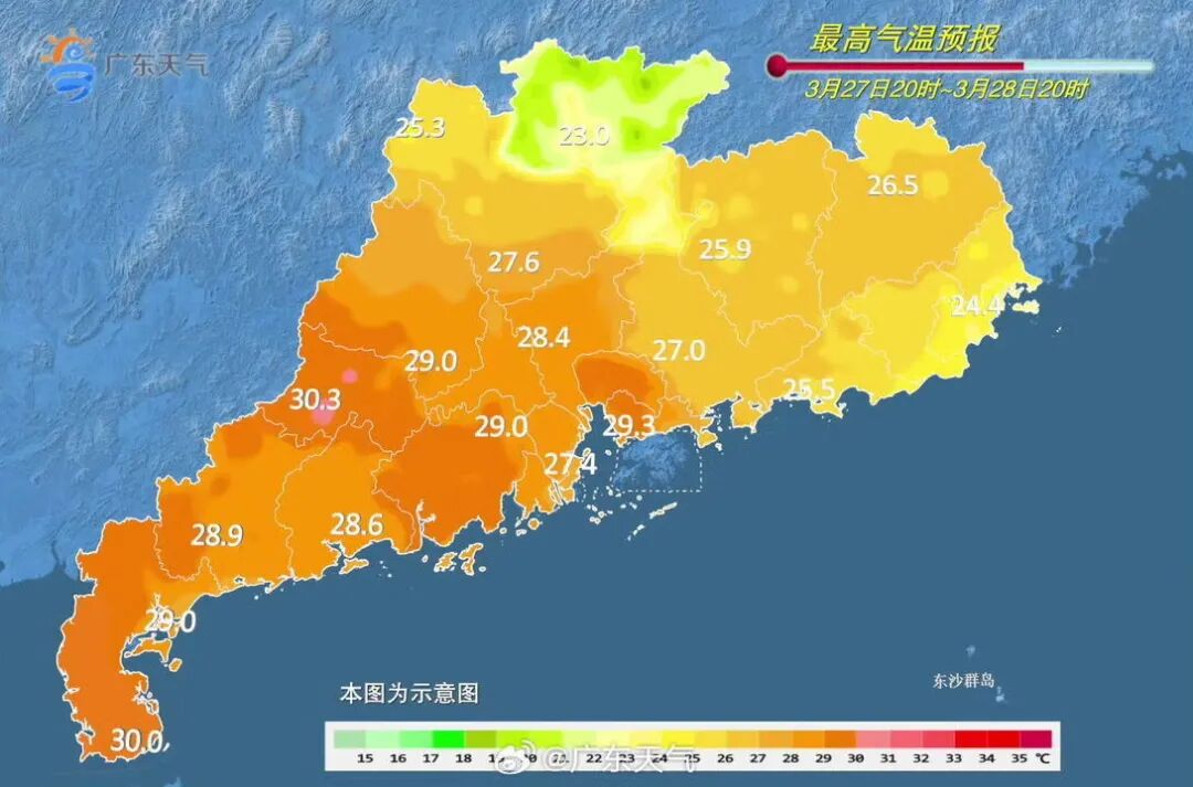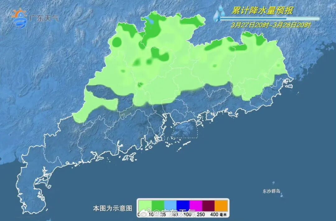 据@广东天气消息,预计,27日开始,我省降水将趋于频密,雨势趋于明显,雨雾时能见度偏低,其中27-29日韶关、清远、肇庆北部、河源北部和梅州北部市县有中(雷)雨局部大雨或暴雨。另外29日前后西北部的部分市县雷雨时伴有短时强降水、8级左右雷雨大风和冰雹。