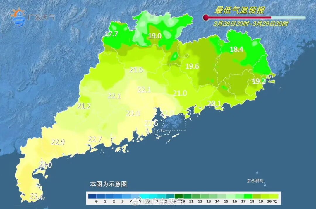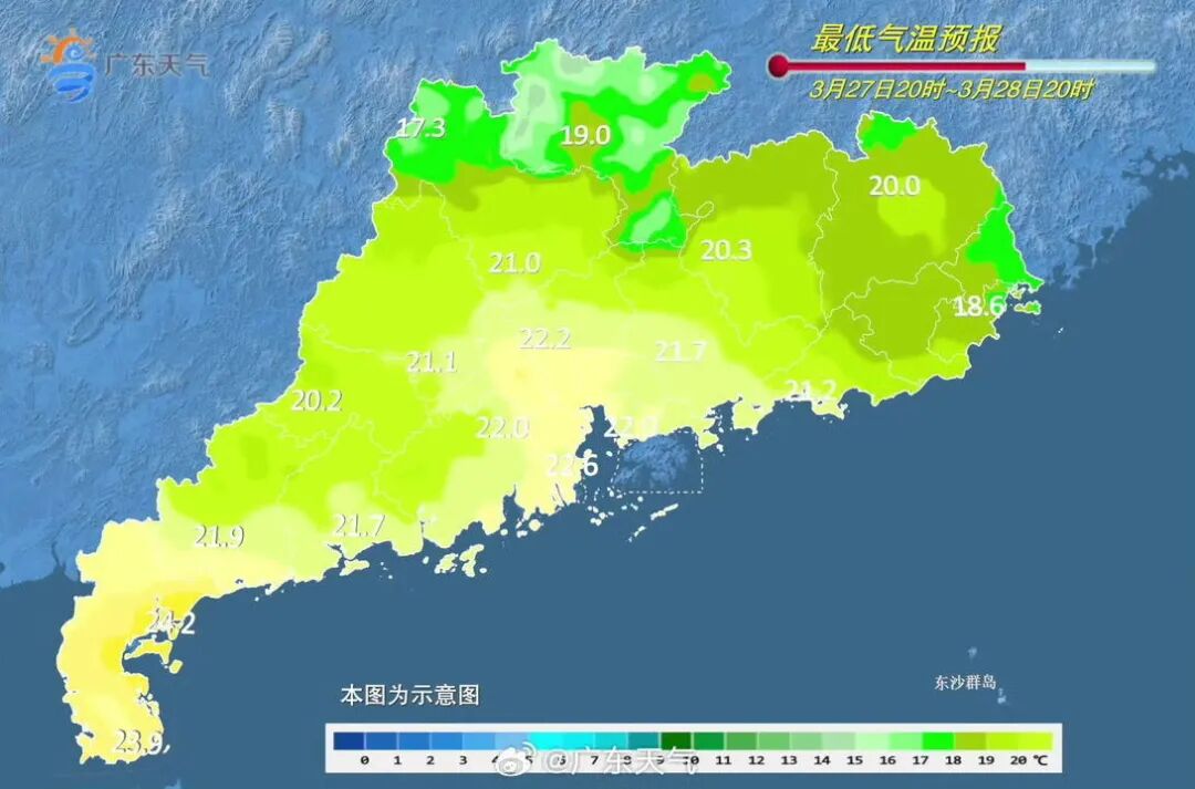 肇庆、清远和韶关市县阴天,有中雷雨局部大雨或暴雨,珠江三角洲其余市县、河源北部和粤西大部市县阴天间多云,有雷阵雨局部大雨;上述地区雷雨时伴有8级左右雷雨大风,部分市县有冰雹;其余市县多云间阴天,局部有小雨。大部市县早晚有轻雾或雾,白天最高气温:清远、韶关和肇庆北部市县24~27℃,雷州半岛市县30~33℃;其余大部市县27~30℃。