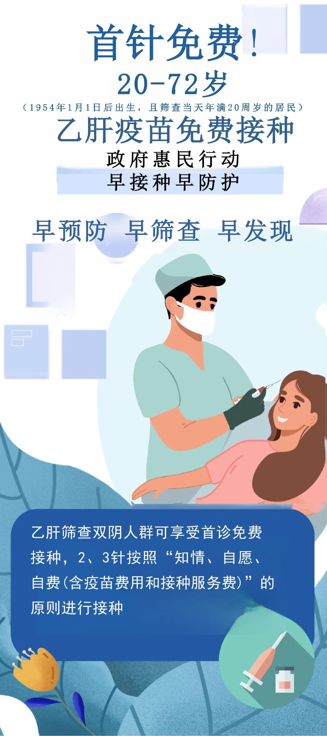 您好!病毒性肝炎是严重危害健康的常见病,尤其乙肝、丙肝长期感染可导致肝硬化和肝癌。据统计,我国80%以上的肝癌与这两种肝炎相关。为保障市民健康,实现早筛查、早预防、早治疗,勒流街道已正式启动免费筛查及首针乙肝疫苗接种活动。