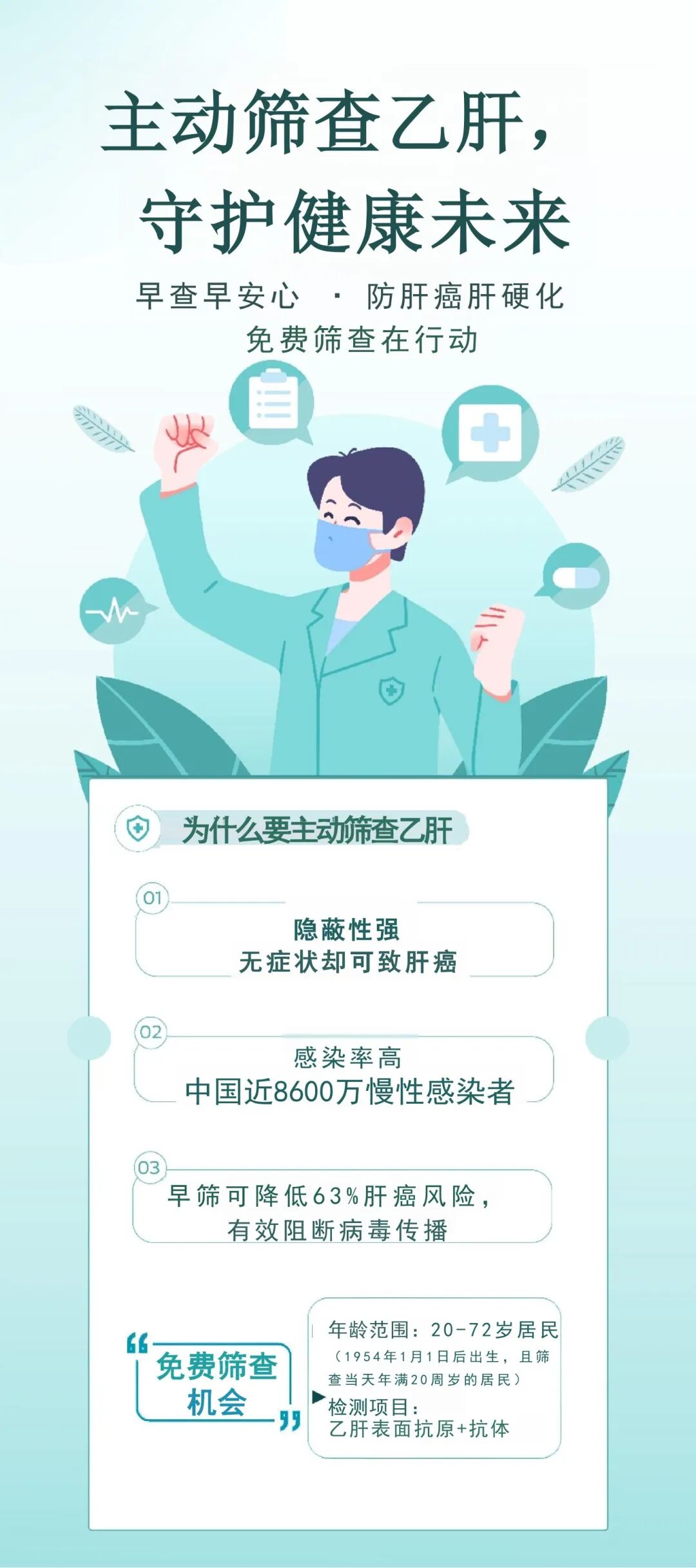 早筛查,早安心。无抗体可接种疫苗获得保护,早发现早治疗能有效阻断病毒性肝炎进展,大大降低肝癌风险。让我们携手行动起来,牢固树立“每个人都是自己健康第一责任人”的理念,共同守护自身与家人的健康!