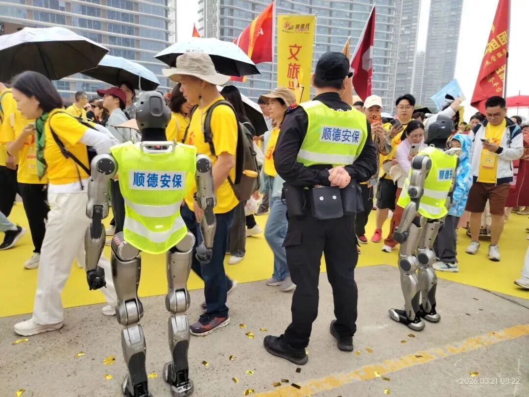2026年佛山50公里徒步现场,来自金玛的机器人“保安”嵌入顺德安保系统展开作业,路过的人们都忍不住举起手机拍下这幅“人机协作”画面。