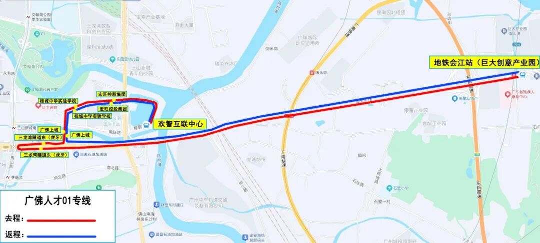 欢智互联中心、宏旺控股集团、桂城中学实验学校、广佛上城、三龙湾隧道东(虎牙)、三龙湾隧道东(虎牙)、地铁会江站(巨大创意产业园)、广佛上城、桂城中学实验学校、宏旺控股集团、欢智互联中心。