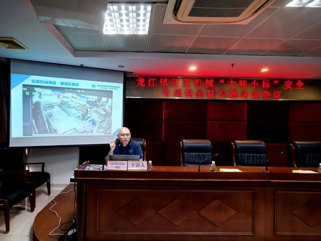 随后,顺德区特种设备协会高级工程师杨凯就起重机械相关典型案例及起重机械“大吨小标”整改进行详细讲解。杨工首先就特种设备相关法律法规及安全技术规范进行解读,详细讲解起重机械使用单位应承担的责任和义务。随后结合区内起重机械典型事故案例,从地控操作工人的不安全行为、设备的不安全状态、安全管理制度落实等方面,深刻剖析了事故发生的原因教训,进一步明确了抓好起重机械安全管理的有关措施要求,给全体参会人员上了一堂既生动又深刻的警示教育课。最后,他还现场解答了企业参会人员提出的起重机械“大吨小标”如何整改相关问题。