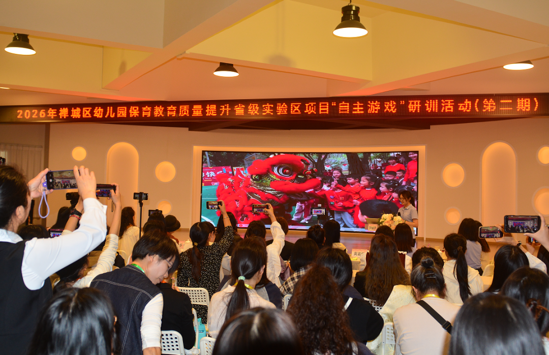 近日,禅城区“幼儿园游戏课程中的传统文化教育”主题交流活动在南庄镇中心幼儿园举行,来自广州、肇庆、惠州等地教育同行共200余人参与了活动。从“各自为战”到“共建共享”,禅城以开放包容的教研姿态积极打造学前教育“教研大共同体”,以跨域合作与文化共融为纽带,深化教研转型,促进经验交流,探索非遗融入幼儿园游戏课程的创新路径。