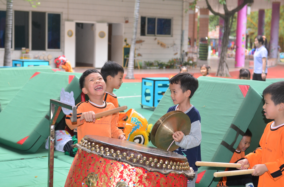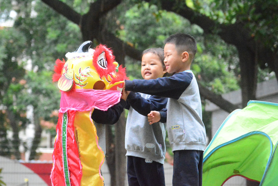 活动当天恰逢农历二月初二“龙抬头”,与会人员现场观摩了幼儿自主游戏与岭南文化材料的自然互动。幼儿园投放狮子头、大小鼓、火龙、红色纸布条等本土材料,幼儿在自主游戏中自由选择、创作表现,教师专注观察倾听,让传统文化在真实游戏场景中生动传承。