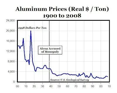 尽管铝价在1900年已经下跌了很多,但是其仍然从1900年的每吨14000美元跌到今天的3000美元左右,跌幅超过70%丨AEI