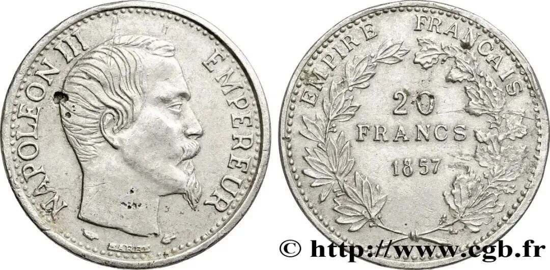 1857年拿破仑三世铝制20法郎,含铝量 3.3 克,同时代20法郎金币含金量为5.8克(cgbfr)