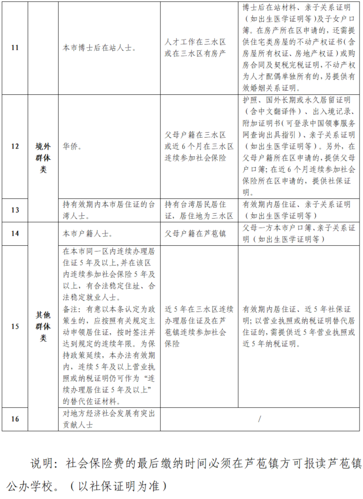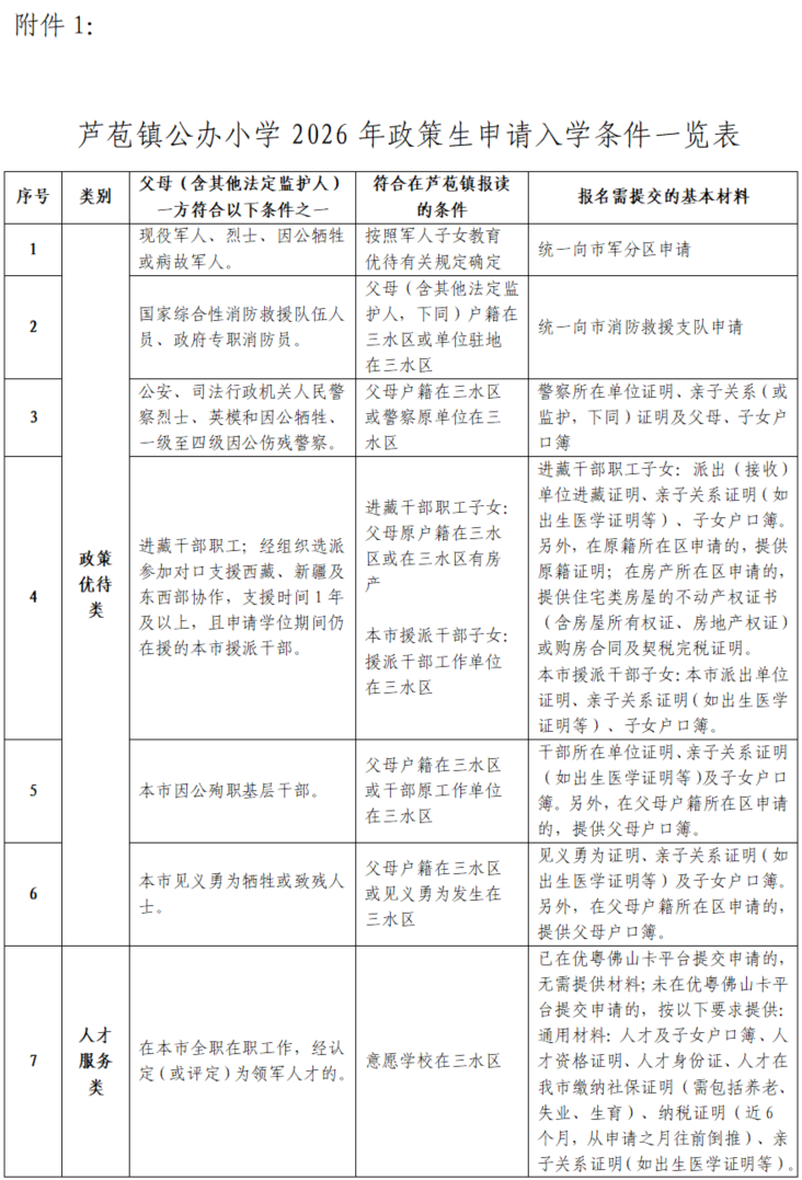 芦苞镇2026年秋季学期 公办小学一年级招生方案 根据《中华人民共和国义务教育法》《佛山市非户籍适龄儿童少年入读公办义务教育学校实施办法》和《佛山市新市民积分制服务管理办法》,以及相关文件精神,结合芦苞镇的实际,特制定芦苞镇2026年秋季学期公办小学一年级招生方案,具体如下: 一、招生计划和招生范围 2026年秋季学期,芦苞镇航空科技实验小学计划招生315人,蔡边小学计划招生90人,新乐丰小学计划招生36人,招生范围为芦苞镇辖区。 注意事项:本次招生分两批次进行。 第一批是网上报名,本次报名只受理户籍适龄儿童(含符合在芦苞镇入学条件的佛山市内户籍适龄儿童)和符合政策生条件的佛山市外户籍适龄儿童报名。第一批报名统一使用三水区招生报名系统进行网上报名,每个适龄儿童如符合三水区两个或以上镇(街道)入学条件的,只能选择三水区内其中一个镇(街道)报名。报读三水区实验小学、西南街道中心小学和西南街道实验小学(原西南街道中心小学实验校区)的除外,如果被上述小学录取了则不再安排学位。报读芦苞镇公办小学的可以选择三个报读志愿学校,请各家长考虑清楚后再填报。 第二批是不符合政策生条件的佛山市外户籍儿童,需要通过积分入学的方式申请学位,积分生不需要参加本方案指引的网上报名,详情请留意积分入学方案,按规定时间办理积分。积分入学方案预计4月2日前后在“印象芦苞”微信公众号公布。 请各家长务必根据下面各类招生对象的定义,明确自己小孩所属类型,谨慎填报。 二、年龄要求 1.小学一年级招生对象必须是年满6周岁的适龄儿童,即2020年8月31日(含31日)前出生,且未入读小学的儿童。不满6周岁的不能报名。 2.如发现在读生重新申请新生入学的,取消其录取资格,注册或开学后发现的也需退学处理。 三、招生对象及条件 (一)符合入学优待政策人员子女。 (二)芦苞镇户籍适龄儿童。 (三)佛山市非芦苞镇户籍适龄儿童。 佛山市非芦苞镇户籍适龄儿童在芦苞镇申请入读公办小学必须符合以下条件之一: 1.儿童父(母)是芦苞镇户籍的。 2.三水区非芦苞镇户籍儿童的父(母)、祖父(母)、外祖父(母)在芦苞镇已获得住宅房屋权属证书的(含房屋所有权证、房地产权证、不动产权属证书、已备案购房合同、《佛山市三水区商品房买卖合同登记备案证明》)。 3.佛山市非三水区户籍儿童的父(母)在三水区工作并连续缴纳社保一年以上,且在芦苞镇获得80平方米以上的住宅房屋权属证书的(含房屋所有权证、房地产权证、不动产权属证书、已备案购房合同、《佛山市三水区商品房买卖合同登记备案证明》)。 4.儿童的父(母)在芦苞镇工作,并在芦苞镇连续缴纳社保36个月或以上的(缴纳社保需连续到2026年3月)。 (四)佛山市外户籍适龄儿童。 1.政策生。 政策生是指符合《芦苞镇公办小学2026年政策生申请入学条件一览表》所列条件之一的人员子女(见附件1),在芦苞镇居住的非佛山市户籍适龄儿童,符合政策生条件的保障录取。儿童与父母均为佛山市外户籍的,儿童父或母必须持有三水区有效居住证才能报名。如果居住证正在办理延期签注手续的,要同时提供办理居(暂)住证历史记录和居住证换证的受理凭证。 儿童父或母在芦苞镇连续缴纳社保五年以上(含五年)且连续办理三水区居住证五年以上(含五年)简称“双五类”政策生,社保条件和居住证条件都需集中在父或母其中一方身上,时间要求必须是从2021年4月到2026年3月连续60个月不间断。 2.积分生。 积分生是指不符合政策生条件的非佛山市户籍适龄儿童,按照《佛山市新市民积分制服务管理办法》,通过积分入学方式分配到公办学位的学生。录取完户籍生和政策生后,如果还有剩余学位,剩余学位将采用积分入学方式招生。申请积分入学并非全部保障入读公办学校,按积分学位数量,根据所有积分入学申请人总积分排名,从高到低录取,录满即止,被录取的学生即为积分生。申请人必须持有芦苞镇有效居住证才能为子女申请积分入学。 四、第一批报名办理流程 (一) 第一批报名流程。 ①了解招生政策→②登陆招生报名系统填报信息→③查看审核结果公告→④查看安排入读学校的公示→⑤按学校通知前往注册。 (二)第一批报名时间。 第一批户籍适龄儿童(含符合在芦苞镇入学条件的佛山市内户籍适龄儿童)和符合政策生条件的佛山市外户籍适龄儿童报名:2026年4月7日9:00至4月13日17:00网上报名(每日23:00--次日8:00为系统维护时间),报名系统4月7日9:00开放接受报名,4月13日17:00关闭报名入口,报名入口关闭后不再受理报名申请。 (三)第一批报名方式。 第一批适龄儿童报名必须网上报名,不接受现场报名。网上报名用手机登录报名,方法如下:微信扫描二维码进入“招生报名系统”点击“幼升小”,根据学生户籍类型选择入口,家长按提示如实填写信息和志愿学校,填写完毕后点击提交即完成信息填报。提交报名信息后,请家长返回报名系统首页点击报名查询,仔细审阅填报的信息是否正确,如需修改的,可按提示进行操作。 (四)关于网上报名的重要提示。 1.报名操作必须由家长(监护人)完成,不能由儿童完成。 2.家长首先要认真阅读招生公告,确认知悉和作出相关承诺后才能填报信息。准备好相关需拍照上传的证件和资料,若信息有误,在报名期间均能登录系统修改。请