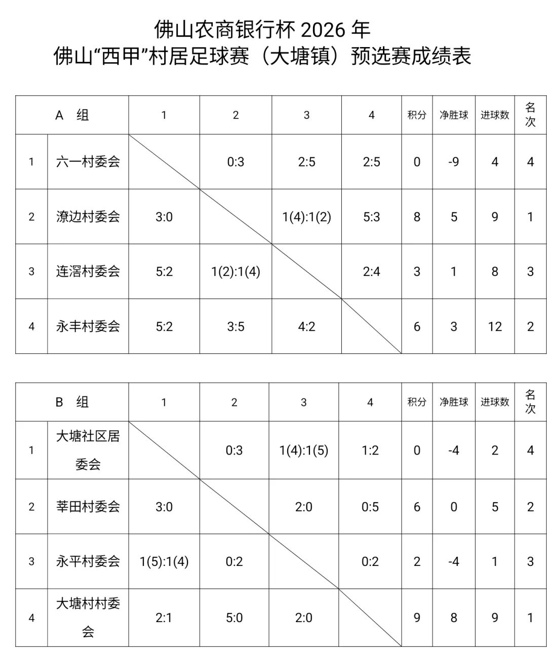 ▲佛山农商银行杯2026年佛山“西甲”村居足球赛(大塘镇)预选赛成绩表。