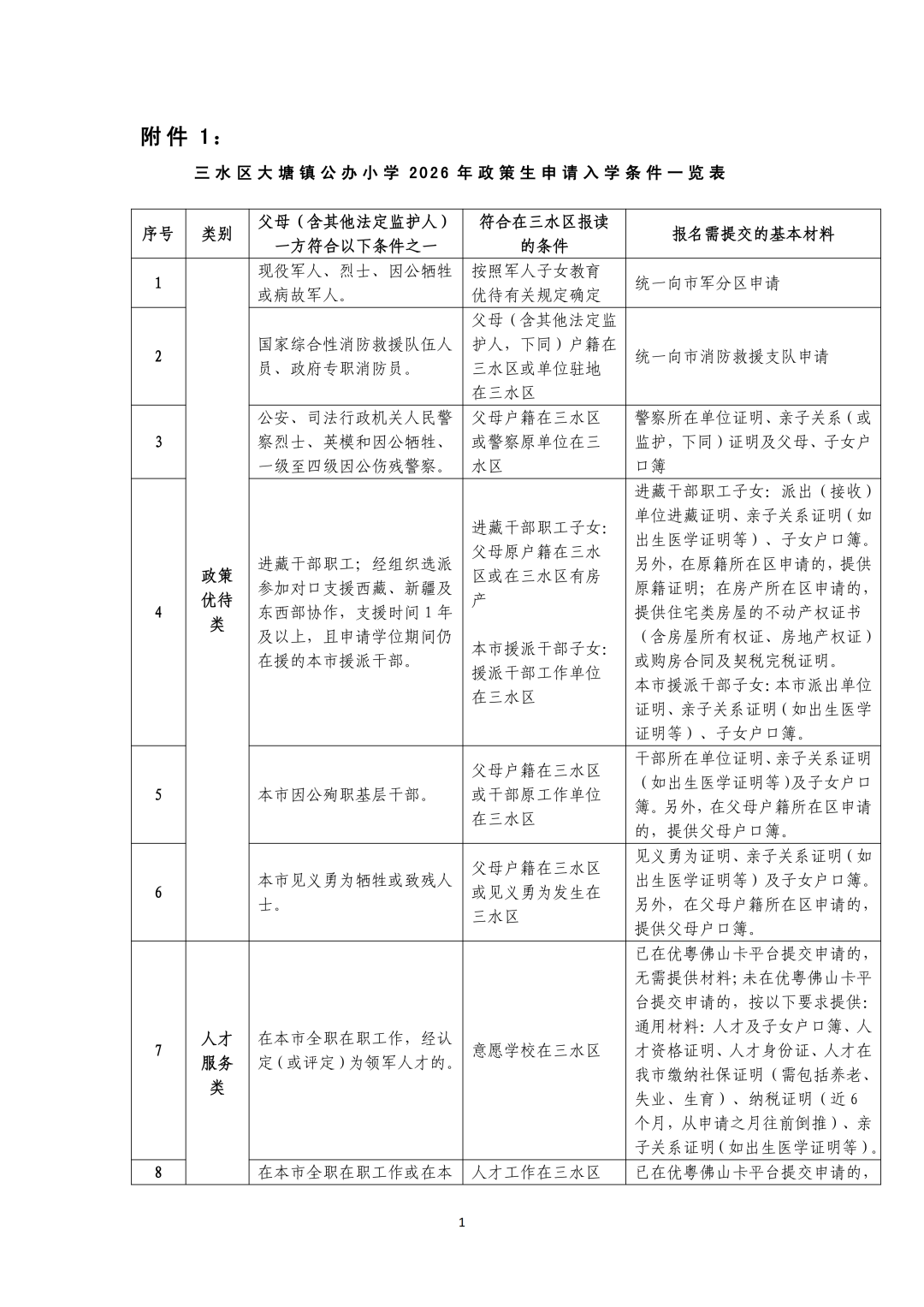 政策生是指符合《三水区大塘镇公办小学2026年政策生申请入学条件一览表》(附件1)所列类别政策生条件之一的人员子女。符合政策生条件的学生,保障入读大塘镇公办小学,由大塘镇教育指导中心统筹安排学位。